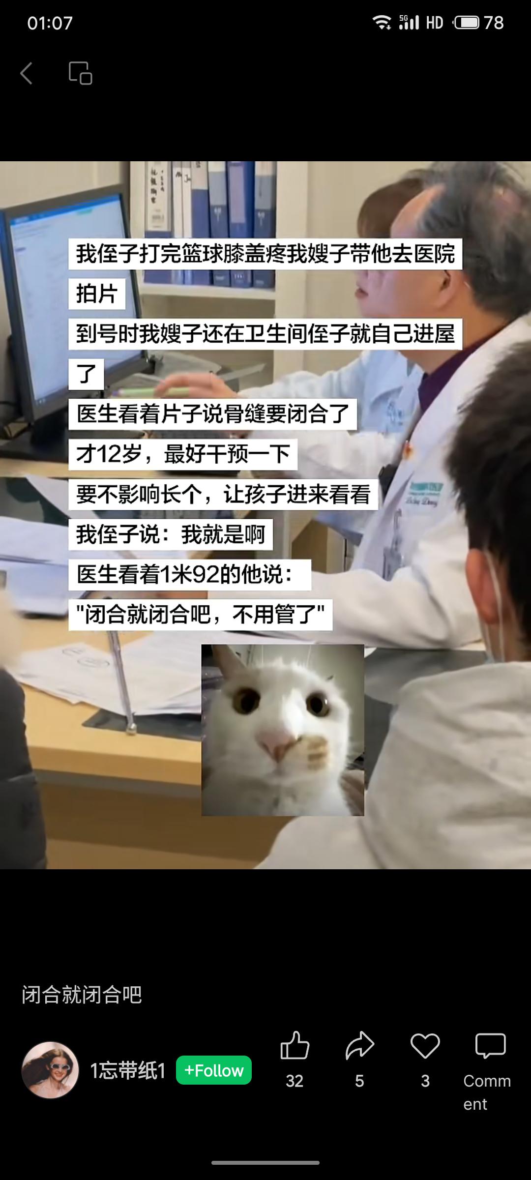 12岁侄子因膝盖疼就诊,医生从其X光片判断骨缝将闭合,建议干预以免影响长高。但当身高1米92的侄子出现在眼前时,医生立即改口:“闭合就闭合吧”,幽默化解了担忧。