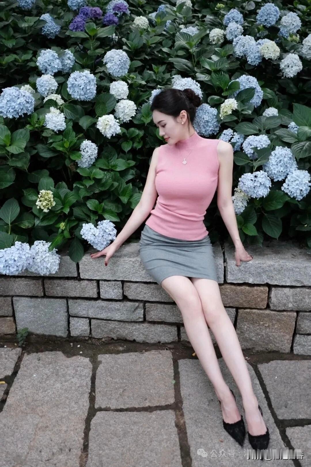 优雅气质,粉色上衣搭配灰色短裙,倚靠花丛,尽显迷人风姿。