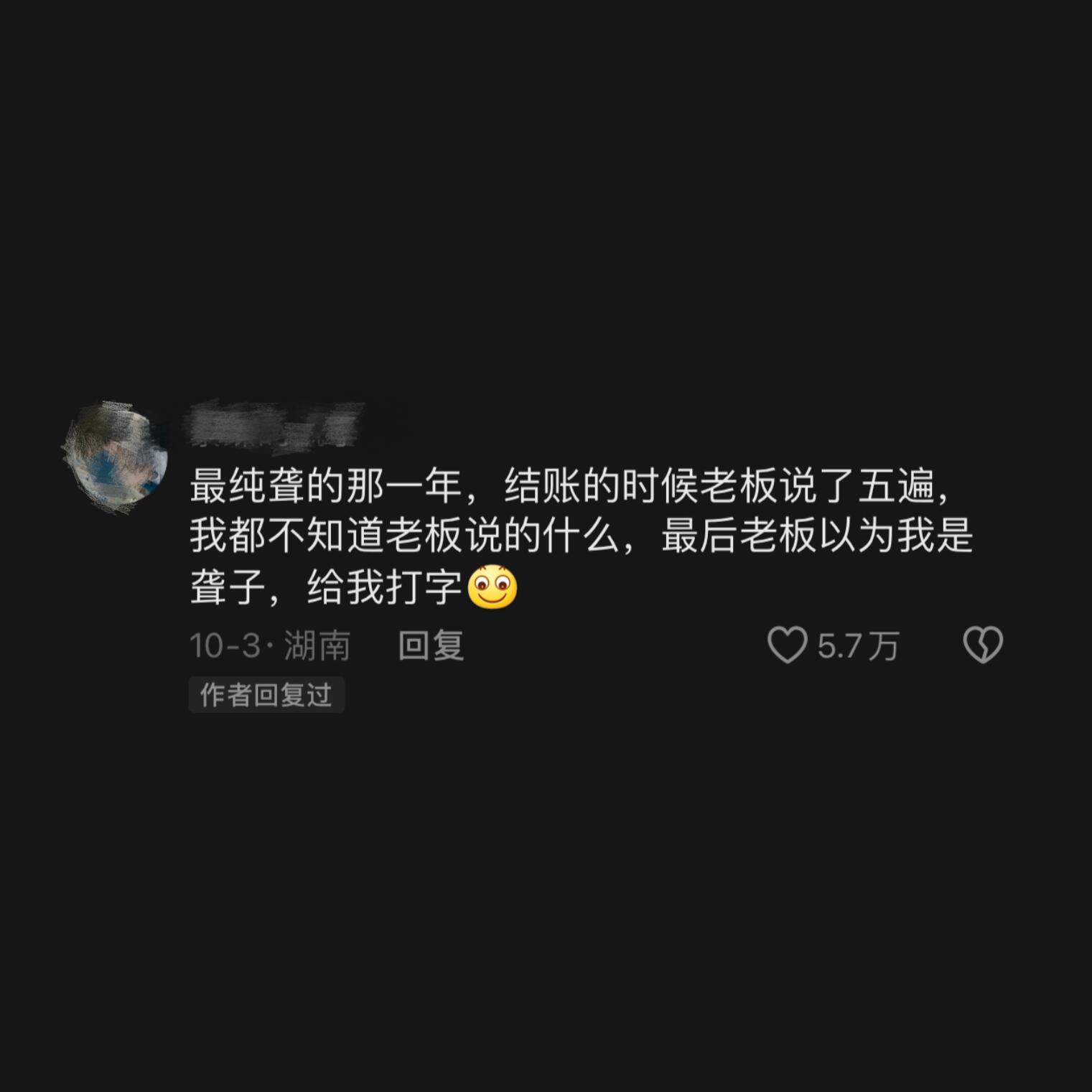 最纯聋的那一年,结账的时候老板说了五遍我都不知道老板说的什么,最后老板以为我是聋子,给我打字