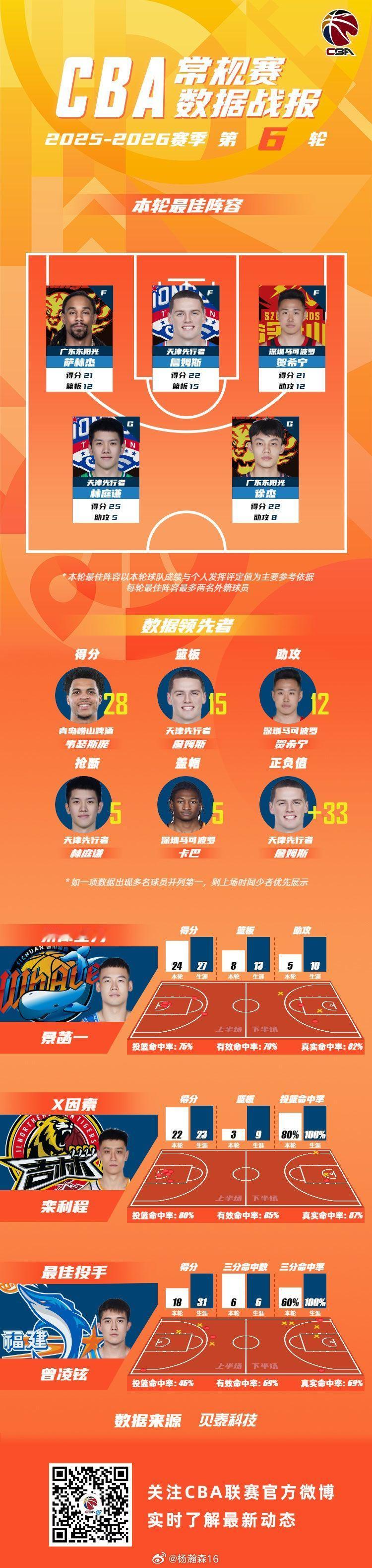 CBA发布第六轮最佳阵容,徐杰入选。国家队首发后卫高铁怒打六铁,狂砍24分 钟。却遗憾入选。cba