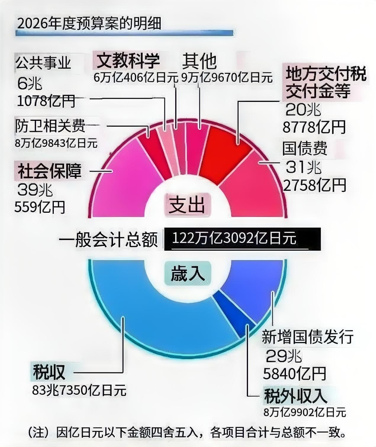 剖析一下日本2026年国家预算,看看钱都用在哪里?军费又增加了多少。 第一个大头是社会保障费,总额为39兆559亿日元(约1.59万亿元人民币),占整个国家预算的31.9%。 社会保障费已突破39兆559亿日元,相当于国家预算的近三分之一。这笔钱不是政府愿意花,而是被超高龄社会裹挟着花的,日本老龄化与少子化持续加剧,医疗新药和设备推高成本,物价与工资也在上涨。为此,政府不得不大幅提高医疗报酬,最近一次上调幅度达3.09%,创下近30年最高。如今,社保体系如同一台老旧却停不下来的机器,只能不断注入资金。预算比上年度又增2.0%,再次刷新历史最高纪录。 第二个大头是日本国债,费用首次突破30兆日元关口,达到31.28兆日元(约1.40万亿元人民币),占国家预算四分之一以上。这已是连续第六年创下新高。 一个关键的转变在于,日本告别了长期零利率环境,步入了“有利息的世界”。随着利率快速上升,政府不得不将2025年度的预计利率从2.0%大幅上调至3.0%。这意味着大量到期的低息旧债需要用高息新债来置换,偿债压力骤然加剧。仅利息支付一项,每年就需约13兆日元(约5800亿元人民币)。 防卫经费约为9兆日元,约合4000亿元人民币,继续创历史新高,占国家预算总额的7.3%。日本已于2025年度提前两年达成GDP占比2%的目标,此次进一步增加投入,重点用于构建长距离远程导弹、无人机等沿岸防卫体系。这明显体现了高市政权在防卫领域的积极姿态。 地方交付税交付金达到20兆8778亿日元(约9300亿元人民币),同样刷新历史纪录,占国家预算的17.1%。这一增长主要是为了应对地方财政因物价上涨和人力成本增加所面临的压力,中央因此大幅强化了对地方的财政支援。该交付金是日本中央政府从税收中按固定比例划拨、用于弥补地方财力差距的重要转移支付手段。 在成长投资方面,用于支持AI与半导体发展的经费为1兆2390亿日元(约600亿元人民币),高中生学费全面减免及小学生午餐免费化相关预算约7000亿日元(约310亿元人民币)。这些被视为高市首相实现“强韧经济”目标的关键举措,但其规模与社会保障、国债费用相比,仍显得较为有限。 此外,针对外国人管理相关问题,新增预算1300亿日元(约58亿元人民币),将主要用于开发新的出入境管理系统,并增加相关部门的人员经费。 2026年的国家预算案将在明年1月下旬开始的国会会议进行公开讨论,讨论结果最终将会在3月底前确认。