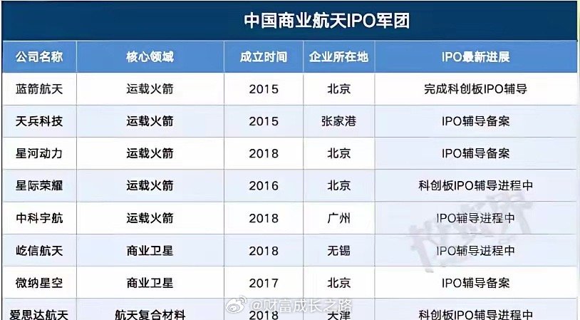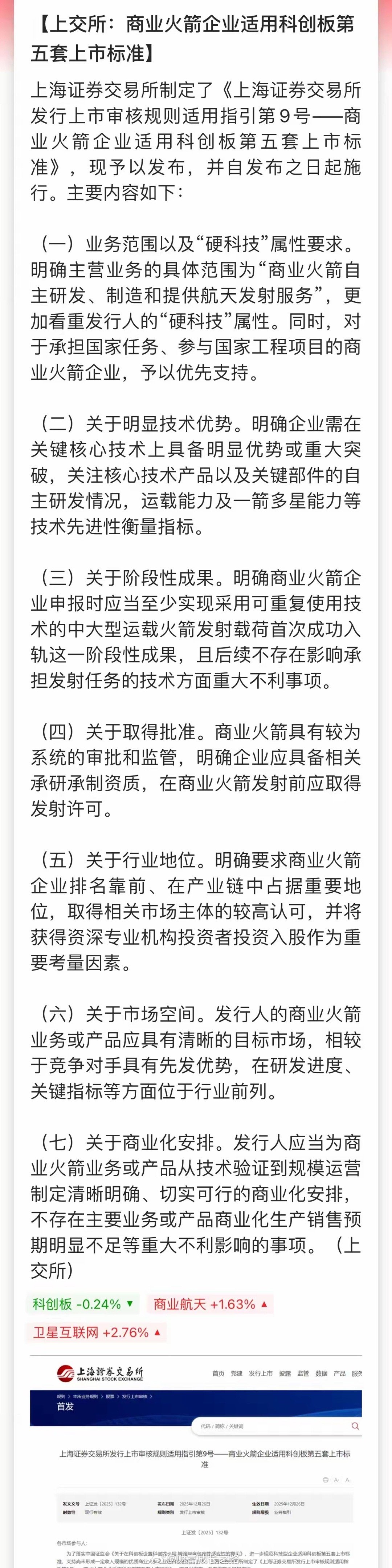 A股商业航天爆发 上交所又给商业航天带货了,商业火箭企业适用科创板第五套上市标准。意味着亏损企业可以上市,跟摩尔线程、沐曦股份待遇一样了!目前看,蓝箭航天已经完成IPO辅导,有望成为第一家冲刺A股上市的。蓝箭航天的“朱雀三号”已经完成国内首飞尝试一级火箭回收,虽说失利,但实现了多项技术突破。总之,商业航天公司IPO窗口打开,蓝箭航天、中科宇航、天兵科技、星河动力都在排队,这又是一场资本市场超级盛宴!要知道如果SpaceX登陆美股,市值估计给到1万亿美元;中国的SpaceX们不得值2000、3000亿人民币啊!就像摩尔线程、沐曦,在一级市场就值200、300亿;上市后就是3000、4000亿了。这是最好的时代,国家支持的新兴行业能大量创富;这是最差的时代,很多老登行业没人理,拿着老登股的也只能暗自伤神了。