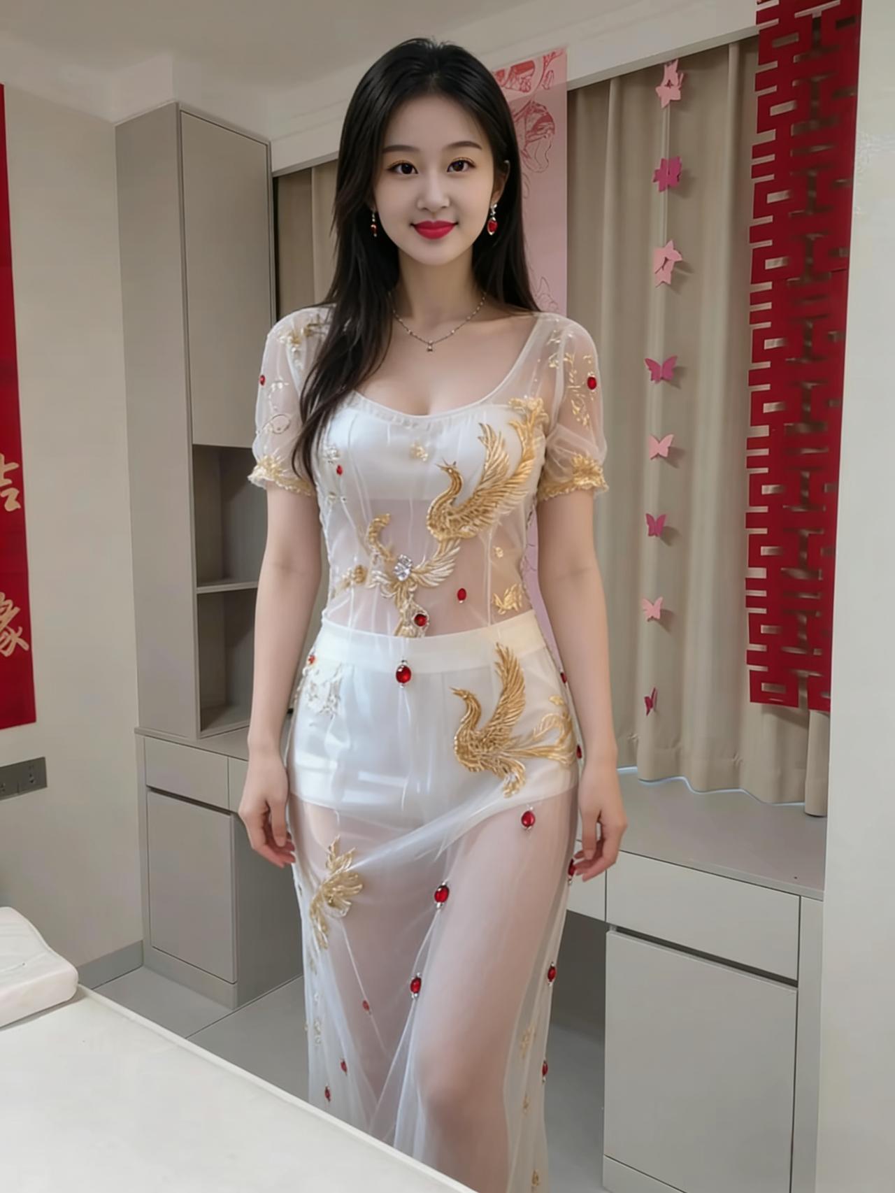 窗棂边的红绸还凝着喜字的余温, 白纱似揉碎的月光,披在肩头。 金线绣的凤凰,翅尖沾了朱砂的红, 在薄纱上游走,像要振翅飞离衣袂。 ~ 耳坠的红珠晃了晃,撞碎一室温柔, 发梢垂落,拂过锁骨的弧度, 如同春水漫过青石的纹路。 指尖轻垂,触到纱料的轻软, 像触到一朵未开的莲,裹着晨露。 ~ 背景里的红蝴蝶剪纸,悬在帘间, 与衣上的红饰遥遥相映, 时光都慢下来,停在温柔的画面里, 任美好在纱纹与金线间,悄悄漫溢。