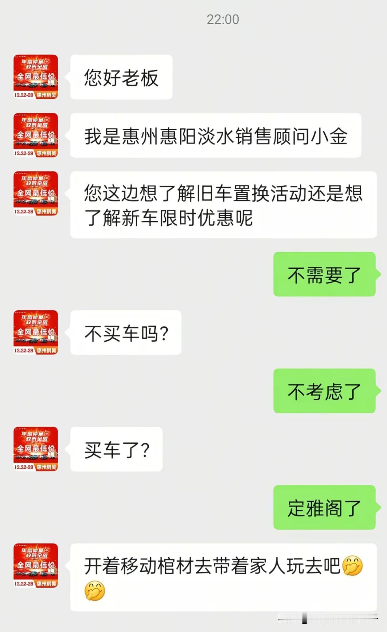 这销售真是又蠢又傻,一句话把雅阁车主和厂家全得罪了。奇瑞4s店一销售得知客户买了雅阁后,居然当场破防咒骂客户:开棺材车带家人去玩,早晚出事! 男子向奇瑞投诉后,该销售已经被门店解雇,奇瑞官方也向男子道歉,表示后续会加强管理,男子见奇瑞态度挺诚恳的,也大度的表示不计较此事了。 可这并不代表广大雅阁车主不计较,得知此事后的雅阁车主,纷纷要求跑到奇瑞官方号下留言,要求给一个说法。 要说这销售真是个人才,如果真是雅阁厂家真追究起来,不就只是丢工作那么简单,说不定还会被起诉造谣,赔偿品牌的形象损失!