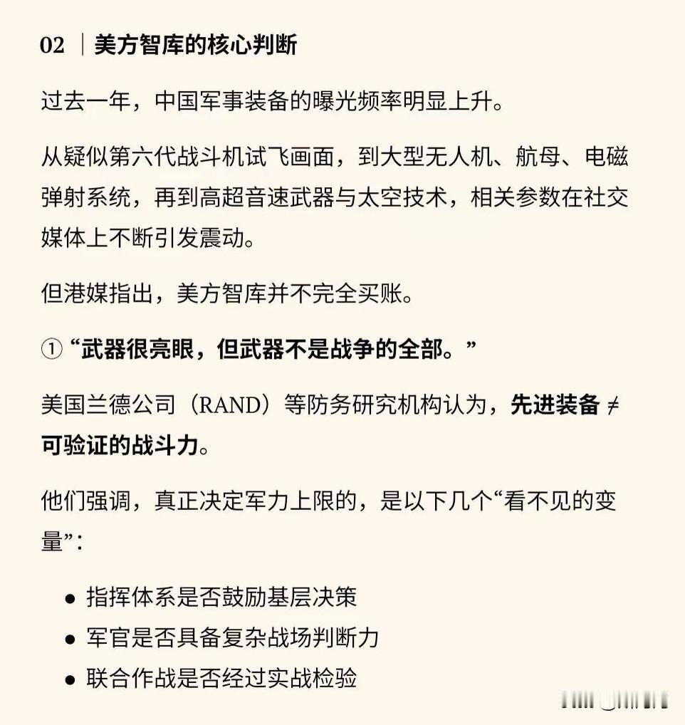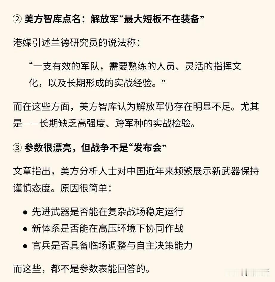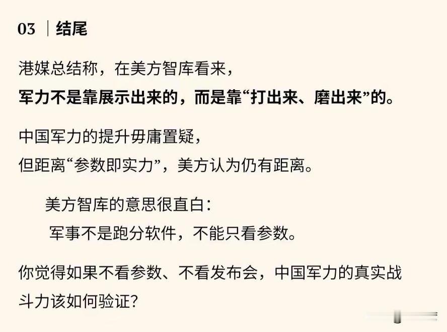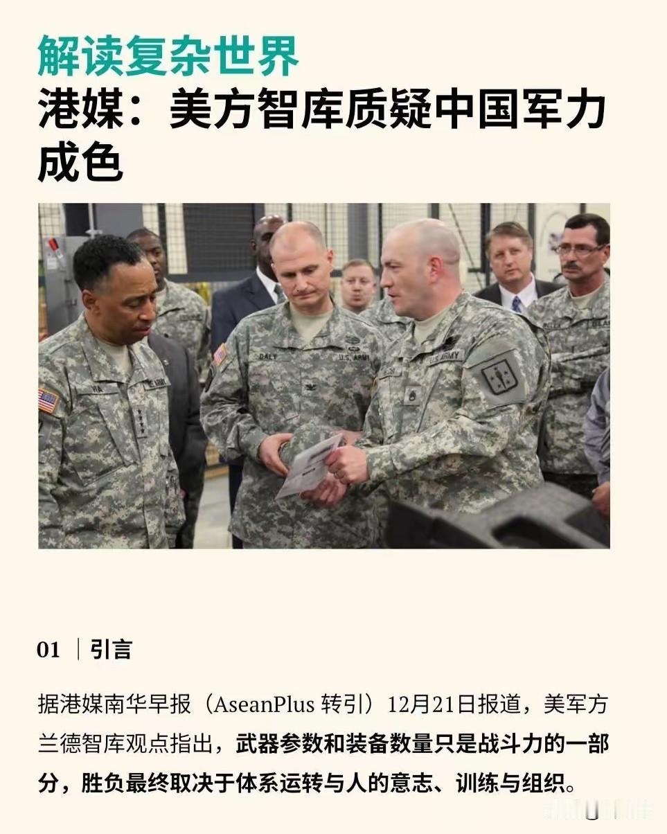 港媒:美方智库质疑中国军力成色! 显然,美方智库通篇内容充斥着骨子里轻视解放军,认为解放军是纸老虎。理由是解放军几十年没有打仗了,尽管中国的武器装备越来越先进,但实战经验严重不足,打起仗来就不好说了。 因此,美方智库表现一副轻视解放军傲慢的样子,严重质疑中国军力的成色。殊不知,他们心里明白57印巴一战,巴基斯坦使用中式体系化作战把印度按在地上摩擦,这充分说明解放军的实力不容置疑。美方智库完全是睁眼说瞎话,回避内心的恐惧和不愿意承认解放军与美军的差距在显著缩小,甚至在某些方面解放军具有全面碾压的优势。 不论美方智库如何质疑,中国军力都会一直在增强。不论美国如何睁眼说瞎话,解放军都不会停下前进的脚步。未来,美国只会越来越害怕中国,这就是硬道理!