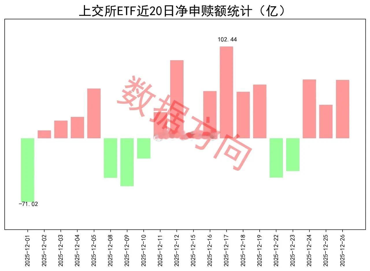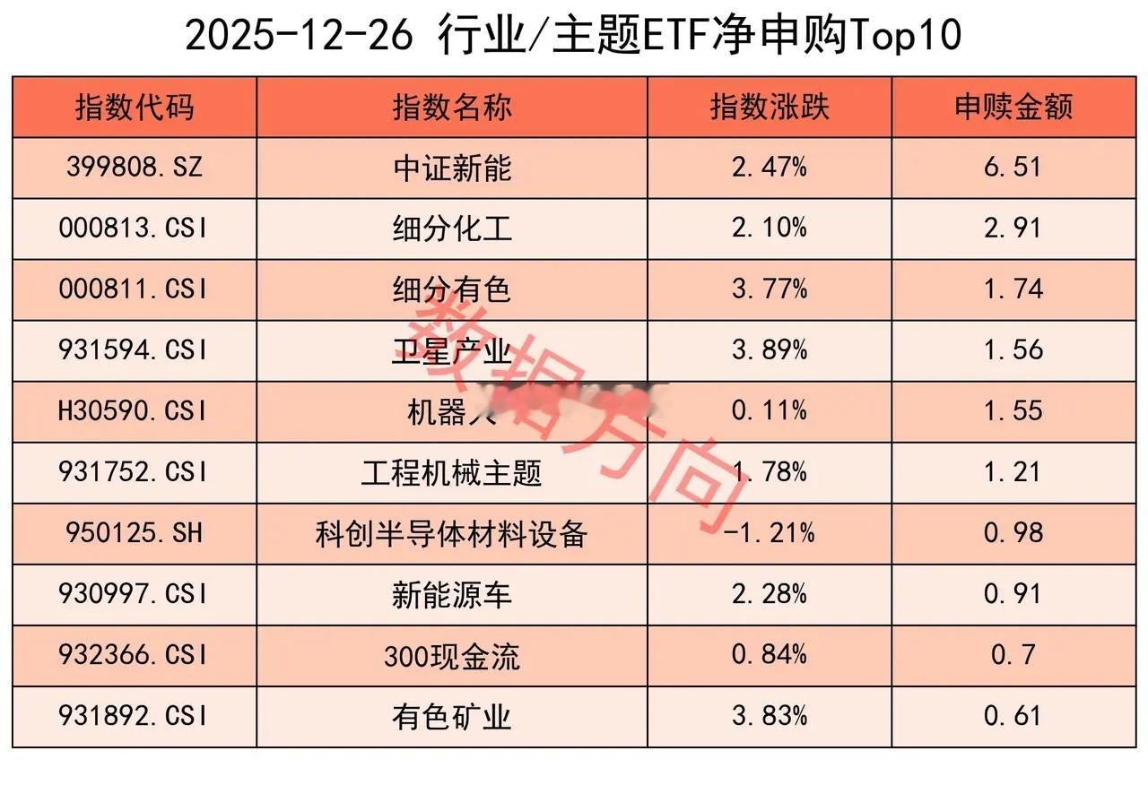 上交所ETF连续三天获净申购!12月26日星期五,大盘放量震荡,大宗商品方向涨幅居前。上证指数涨幅0.10%,连续收出第8根阳线。上交所ETF合计净申购 65.19亿元,这是连续第三天获得净申购。宽指中证500指数(25.5亿)、中证1000指数(21.14亿),双双净申购超过20亿。上证50指数(17.9亿)、沪深300指数(14.94亿),双双净申购超过10亿。科创50指数(5.02亿),净申购超过5亿。科创100指数(2.82亿)、中证A500指数(1.7亿)、上证180指数(0.22亿),分别获小幅净申购。上证指数(-1.7亿)、科创创业50指数(-0.56亿)、中证A50指数(-0.17亿),分别被小幅净赎回。行业和主题 中证新能指数(6.51亿)、新能源车指数(0.91亿),一起进入申购榜;细分化工指数(2.91亿)、细分有色指数(1.74亿)、有色矿业指数(0.61亿),一起进入申购榜;机器人指数(1.55亿)、工程机械主题指数(1.21亿),一起进入申购榜;其他进入申购榜的还有:卫星产业指数(1.56亿)、科创半导体材料设备指数(0.98亿)、300现金流指数(0.7亿)。中证军工指数(-6.58亿)、军工龙头指数(-4.92亿),一起进入赎回榜;证券公司指数(-3.6亿)、300非银指数(-1.39亿),一起进入赎回榜;CS电池指数(-2.38亿)、光伏产业指数(-1.88亿),一起进入赎回榜;其他进入赎回榜的还有:科创芯片指数(-2.42亿)、科创AI指数(-1.93亿)、中证红利指数(-1.56亿)、中证银行指数(-1.36亿)。ETF