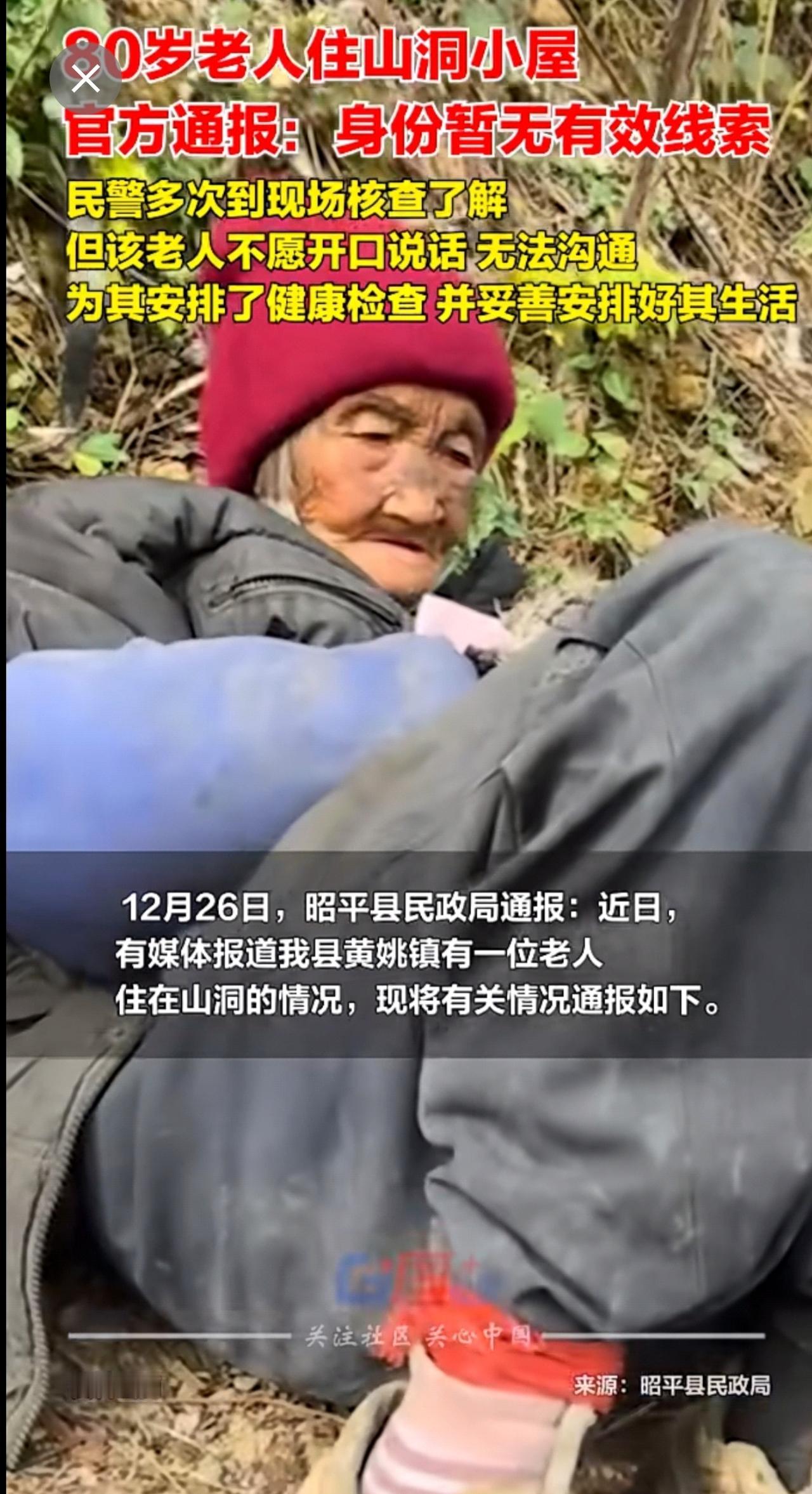 12月26日,昭平县民政局通报:80岁老人住山洞身份暂无有效线索,将继续做好救助工作并帮助其尽快找到家属。