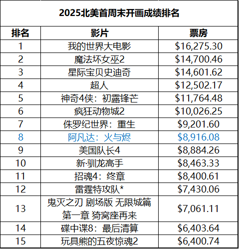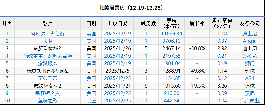 2025年第51周北美票房 :1.《阿凡达3》开画夺冠,成绩不算突出,跟前作比首周票房下滑4成,全球票房5.44亿美元;2. 天使影业圣诞定制电影《大卫》开画表现出色;3.《疯狂动物城2》票房破3亿美元排名年度第6,全球票房12.94亿。(数据:boxofficemojo)