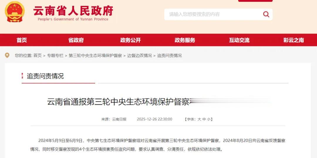 据云南省政府网站消息,12月26日,云南省委、省政府通报第三轮中央生态环境保护督察移交问题追责问责情况。