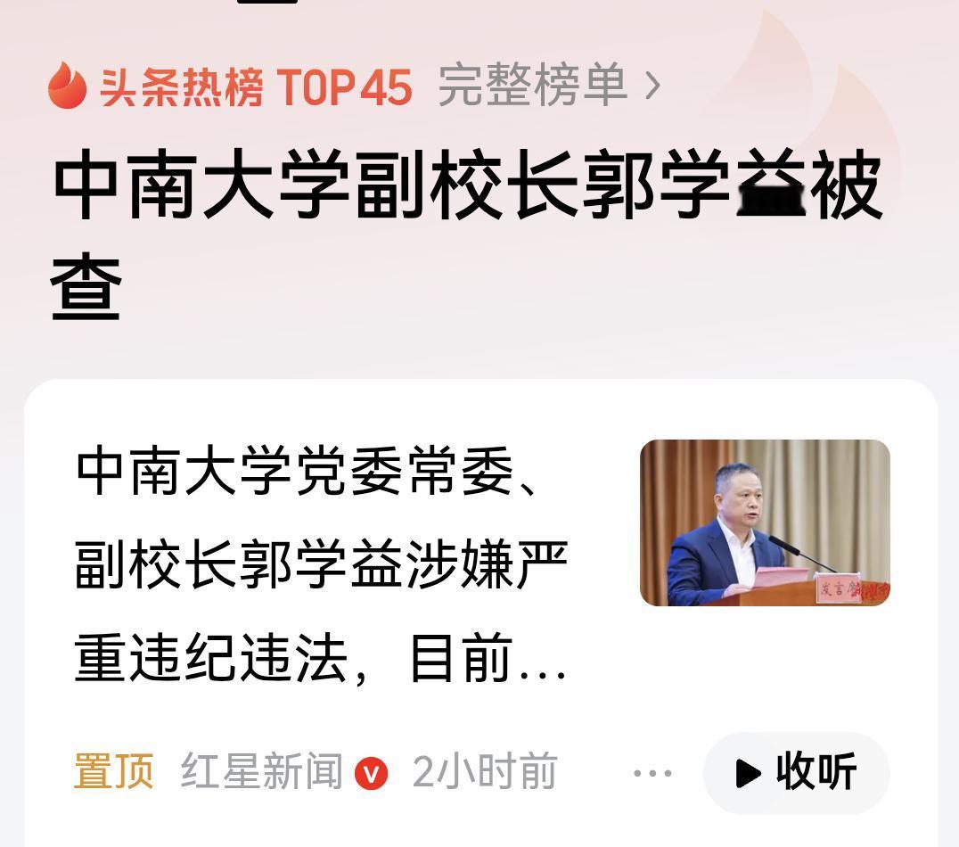 “双一流”高校中南大学副校长郭学益,临退休之前,突然“翻车”。 这个郭学益不简单,他1966年10月出生于湖南长沙,年少之时,学习成绩便十分优异,于1985年,考入了中南工业大学,有色金属冶金专业,本科毕业之后,没有选择踏入社会,迈上工作岗位,反而是继续深造,又在母校中南工业大学有色金属冶金专业攻读硕士,硕士毕业之后,又考取了中南工业大学有色金属冶金专业博士,于1995年10月博士毕业,博士毕业之后,在中南工业大学粉末冶金国家重点实验室进行了两年的博士后研究。 其实他在1995年12月就已经参加工作,也就是进入中南工业大学粉末冶金国家重点实验室开展博士后研究,1998年,32岁的他,就已经晋升为中南工业大学冶金科学与工程学院副教授,此后又去日本佐贺大学理工学部担任研究员一年,还在日本东京大学国际产学共同研究中心担任客座教授,于2002年9月晋升为教授。 2003年,37岁的他,此时已经是中南大学冶金科学与工程学院重金属冶金研究所教授,博士生导师副所长,两年之后,又晋升为中南大学研究生院招生办副主任。在该岗位上工作时间长达5年时间。 光阴匆匆,时间很快来到了2010年,44岁的他已经晋升为中南大学研究生院招生办主任。 并且于2014年6月,正式晋升为中南大学人事处处长,在该岗位上工作两年。 于2016年7月,正式晋升为中南大学党委常委、副校长。在副校长的岗位上,一干就是9年时间,直到此番任上落马。 他曾经主持国家自然科学基金重点/面上项目、国际科技合作专项等课题,在有色金属资源循环利用、先进电池材料领域取得了重大成果,出版专著四部,发表论文200余篇,授权发明专利23项,曾获国家科技进步奖二等奖3项,省部级科学技术一等奖9项。 尤其是在2021年入选中国工程院院士增选有效候选人名单。 单单从这份履历来看,可以说是十分光彩夺目。 学历之路,走得很顺畅,也走得很扎实,既有科研成果,又有行政职务,可以说是两手抓,晋升的速度也很快,32岁就已经晋升为副教授,36岁就已经晋升为教授、博导。 估计现在的学子们也是望尘莫及。 尤其是在今年1月,他刚刚获得2024年度“科技人物”影响力科学家荣誉。 值得注意的是,郭学益的此番“翻车”,其实早已有了两个预兆。 第1个预兆,那便是今年10月17日,曾于2011年10月至2017年5月之间担任中南大学校长的工程院院士张尧学,官宣落马。 第2个预兆,在今年的11月份,郭学益的,名字就从中南大学官网中的“行政领导”名单中撤下。这一点就是很值得玩味,毕竟他今年才59岁,并未到退休年龄。 这里的中南大学是国家985工程重点建设高校,在国内高校圈子都十分知名。 随着官宣消息的发布,也预示着郭学益的好日子将彻底终结于今天,未来等待他的,将不再有高朋满座,也不再有鲜花作用,唯独只有与铁窗为伴。