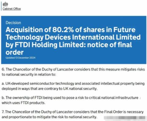 英国再出手!继荷兰抢夺中资控股安世半导体后,伦敦又以“国家安全”为由,迫使中国建广交出FTDI公司80.2%的股份。 这事发生得不仅突然,而且吃相极其难看,FTDI这家公司,全称Future Technology Devices International,总部窝在苏格兰的格拉斯哥,虽说名气没听起来那么大,但在USB桥接芯片这个细分领域,那是妥妥的“隐形冠军”。 咱们平时用的医疗设备、工业控制台甚至高档消费电子里,没准儿都藏着他们的技术,可就在几年前,这家公司的日子并不好过,甚至可以说是岌岌可危。 那时候英国政府在哪?根本没人搭理,直到2021年12月,中国建广资产慧眼识珠,通过旗下公司果断出手,拿下了80.2%的绝对控股权。 请注意这个时间点,这笔收购是在英国那个所谓的《国家安全与投资法》全面生效之前完成的,按理说,法不溯及既往,买卖成交了就是成交了。 可英国人偏不信这个邪,为了搞这笔已经装进中国人口袋的生意,他们硬是启动了法案里的“回溯审查权”。 内阁办公室给出的理由简直让人笑掉大牙,说是FTDI的技术和知识产权如果被咱们拿了,会“违背英国国家安全”,甚至那个并不存在的“所有权风险”会威胁到他们的关键基础设施。 经过长时间的拉扯,尽管中方据理力争甚至提起了司法复核,但到了2025年初,英国高等法院还是驳回了中资的请求,维持强制出售令,这就意味着,咱们真金白银买回来、用心经营的企业,现在必须得按他们的要求吐出去。 看到这,各位是不是觉得这剧情特别眼熟?这哪里是讲法律,分明就是看着别人家把猪养肥了,直接拿着刀上门分肉,这种吃相,大伙说是不是太难看了? 说白了,这帮盎格鲁-撒克逊精英们的脑回路非常有意思,他们的逻辑里藏着一个巨大的悖论:当FTDI这种高科技企业快要破产、在那苟延残喘的时候,英国政府觉得它是安全的,因为它没有价值,死了也就死了,完全不值得一看。 可一旦中国资本进场,注入资金、盘活资源,把企业救活了,甚至让它在国际市场上重回巅峰了,这帮人立马就跳出来喊“不安全”了。 这根本不是什么维护国家安全,这就是赤裸裸的“摘桃子”,他们就是看准了中国企业在海外投资过程中的软肋:你出钱出力搞研发、搞市场,等到果子熟了,我就用一纸行政命令把它收割走。 从荷兰配合美国抢夺光刻机、逼退安世半导体,再到如今英国对FTDI下手,这已经不再是孤立的个案,而是一套成体系的“海盗战法”。 西方国家现在玩的就是这种“关门打狗”的套路,先把你的资金骗进来,等你把产业做起来了,再把门一关,连骨头带肉全给你吞了。 这就让人不得不重新审视那个被他们挂在嘴边的“契约精神”,过去几十年,这帮列强靠着先发优势,满世界宣扬自由贸易、市场规则,那是因这套规则是他们定的,他们能稳赢。 现在中国企业靠本事在规则内赢了,他们玩不起了,直接掀桌子,这种行为,本质上和几百年前开着炮舰在大海上抢劫商船的强盗没有任何区别,只不过以前手里拿的是火枪,现在手里拿的是所谓的“法律文书”和“合规审查”。 面对这种局面,要是咱们还抱着“清者自清”或者“只要合规就能生存”的幻想,那最后只能是被人家吃干抹净,人家已经不再掩饰那种强盗本性了,咱们也没必要再跟他们讲什么温良恭俭让。 什么叫“退一步海阔天空”?在群狼环伺的国际丛林里,退一步就是万丈深渊,要是靠签协议、打官司能管住这帮强盗,那这个世界早就和平了。 现在最紧要的,不是去反思我们的投资备案完不完善,而是要建立起对等的“痛感机制”,既然英国可以随意剥夺中国企业的合法资产,那我们是不是也该拉个清单,把那些在中国赚得盆满钵满、背地里却搞小动作的国家列进去? 你动我的半导体,我就动你的金融、动你的优势产业,如果不把拳头打出去,不把他们打疼,这种“软性抢劫”只会越来越多。 世界和平从来不是靠忍让换来的,而是靠斗争保卫出来的,只有当你拥有了随时能让对方付出惨痛代价的能力,所谓的规则和公平,才会真正降临。 面对这种披着法律外衣的强盗行径,咱们是该继续忍气吞声讲道理,还是该列个清单痛击回去?欢迎在评论区留下你的高见。 参考资料:英国内阁办公室
