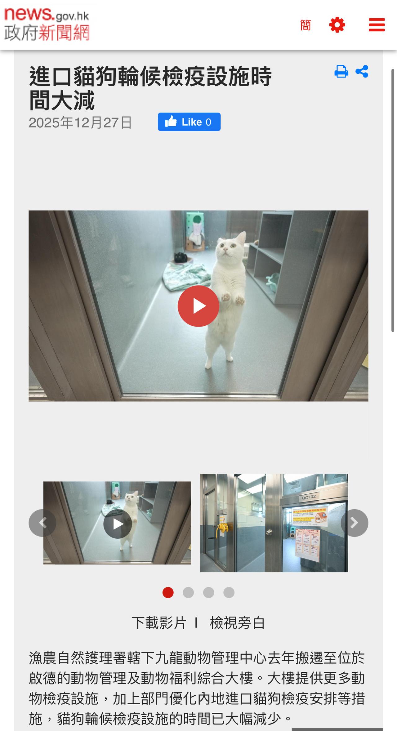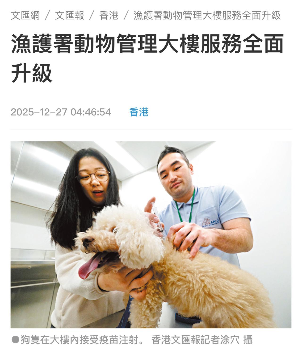 【港闻】【(香港特区)进口猫狗轮候检疫设施时间大减】 〈(香港特区)渔护署动物管理大楼服务全面升级〉 渔农自然护理署辖下九龙动物管理中心去年搬迁至位于启德的动物管理及动物福利综合大楼。大楼提供更多动物检疫设施,加上部门优化内地进口猫狗检疫安排等措施,猫狗轮候检疫设施的时间已大幅减少。 大楼提供各种与动物相关的公共服务,包括进口猫狗的狂犬病检疫服务。大楼设有猫狗检疫房间各20个。 渔护署兽医师(动物管理)关晋乐指出,大楼的狗只检疫设施面积约为土瓜湾旧址两倍,猫只检疫设施占地约为旧址三倍,另提供活动空间,让饲主陪伴狗只。中心全年无休,市民只要提前预约便可探视自己的宠物。 渔护署早前把内地纳入第三A组别,并优化从内地进口猫狗的检疫安排,由内地进口的猫狗只要符合相关规定,抵港后的检疫期可由120天大幅缩减至30天。 部分进口猫狗的检疫期缩短,加上启德的大楼提供更多检疫设施,以及爱护动物协会的猫只检疫中心6月启用,进口猫狗轮候检疫设施的时间得以大大减少。 渔护署兽医师(签证及认证)余栩慧说,进口狗只轮候渔护署检疫设施的时间已由去年10月约12至15个月,减至目前约3至6个月;猫只轮候设施时间则由约15至18个月,缩短至现时约12个月。 署方已主动联络较多出口动物到香港的地区,介绍本港的检疫安排,并探讨将有关地区纳入第三A组别的可行性。 大楼除有动物检疫设施,更有460个动物暂住设施,接收被弃养动物、流浪猫狗等,也设兽医化验所、教育中心。大楼地下接待处向公众开放,提供狗只疫苗接种和发牌服务。 香港 宠物 进口 检疫