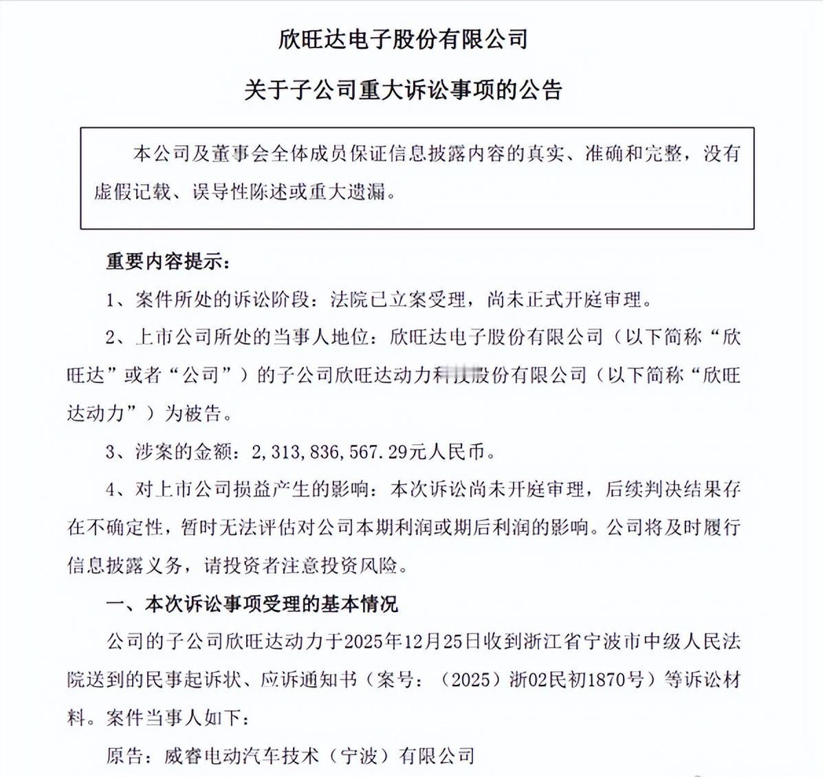 吉利集团关联公司威睿电动(极氪持股 51%、吉利持股 49%)起诉欣旺达动力,索赔 23.14 亿元及相关费用,理由是后者 2021 年 6 月至 2023 年 12 月交付的电芯存在质量问题。 涉案电芯主要供应极氪车型,覆盖 2021-2023 年产部分极氪 001、极氪 7X。极氪已为相关车主提供免费电池检测与更换服务,并于 2023 年底终止合作,2024 年新款车型改用宁德时代电池。 此外,理想 L6/L7/L8/L9 智能焕新版、MEGA、i8 等车型部分版本,因交车周期优势采用欣旺达电池。目前该案尚未开庭,判决结果存在不确定性,相关车主可关注后续进展。