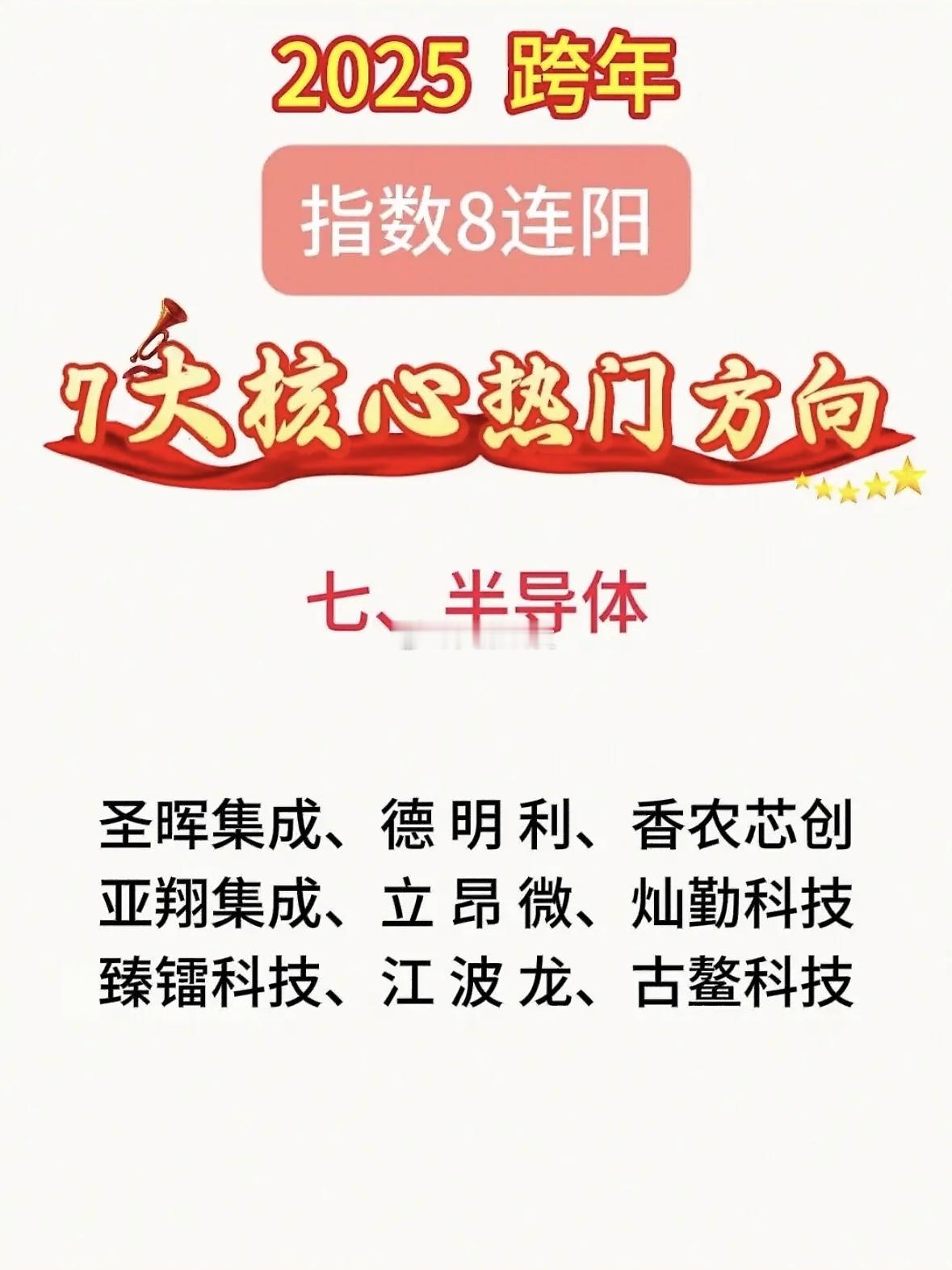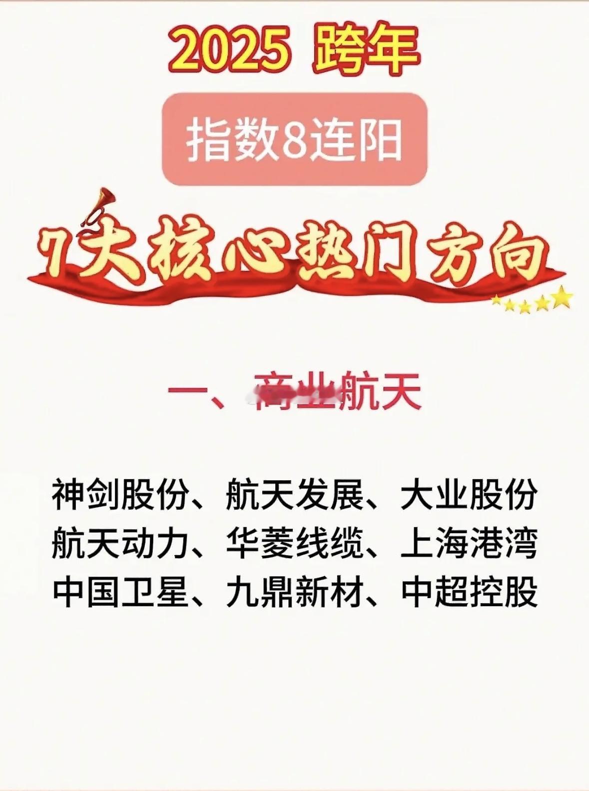2025年跨年行情喜迎“开门红”,A股市场已录得连续8日上涨。半导体作为科技核心赛道,呈现出七大结构性热点方向,在技术突破与国产替代的双重驱动下,产业链景气度持续上行。与此同时,商业航天板块成为跨年行情的市场焦点。以$神剑股份 sz002361$ 、$中国卫星 sh600118$ 为代表的产业链核心标的持续获资金关注,板块热度显著攀升,技术图形呈现强势连阳态势,预期后续仍有成长空间可期。财经股票今日盘面分析