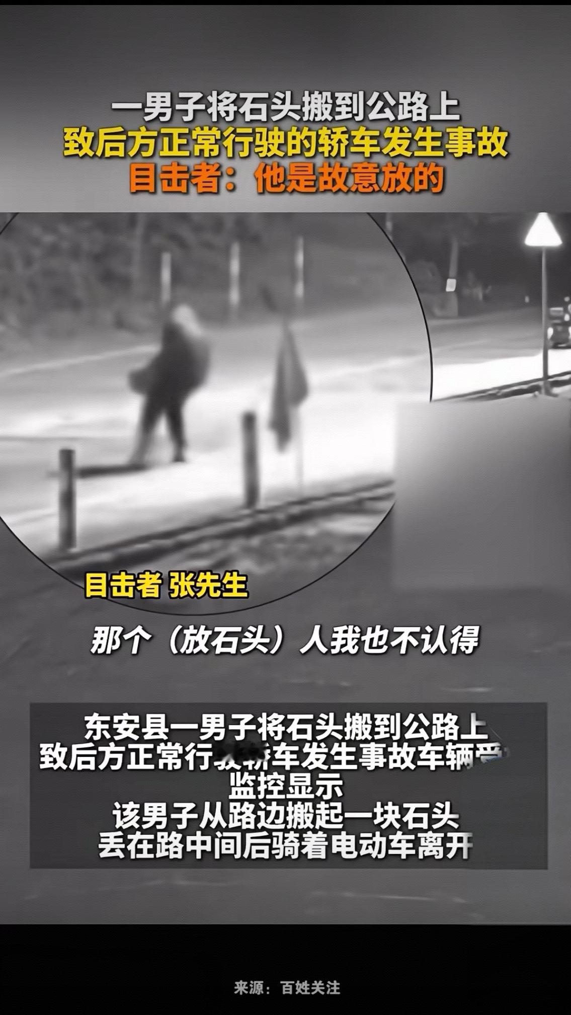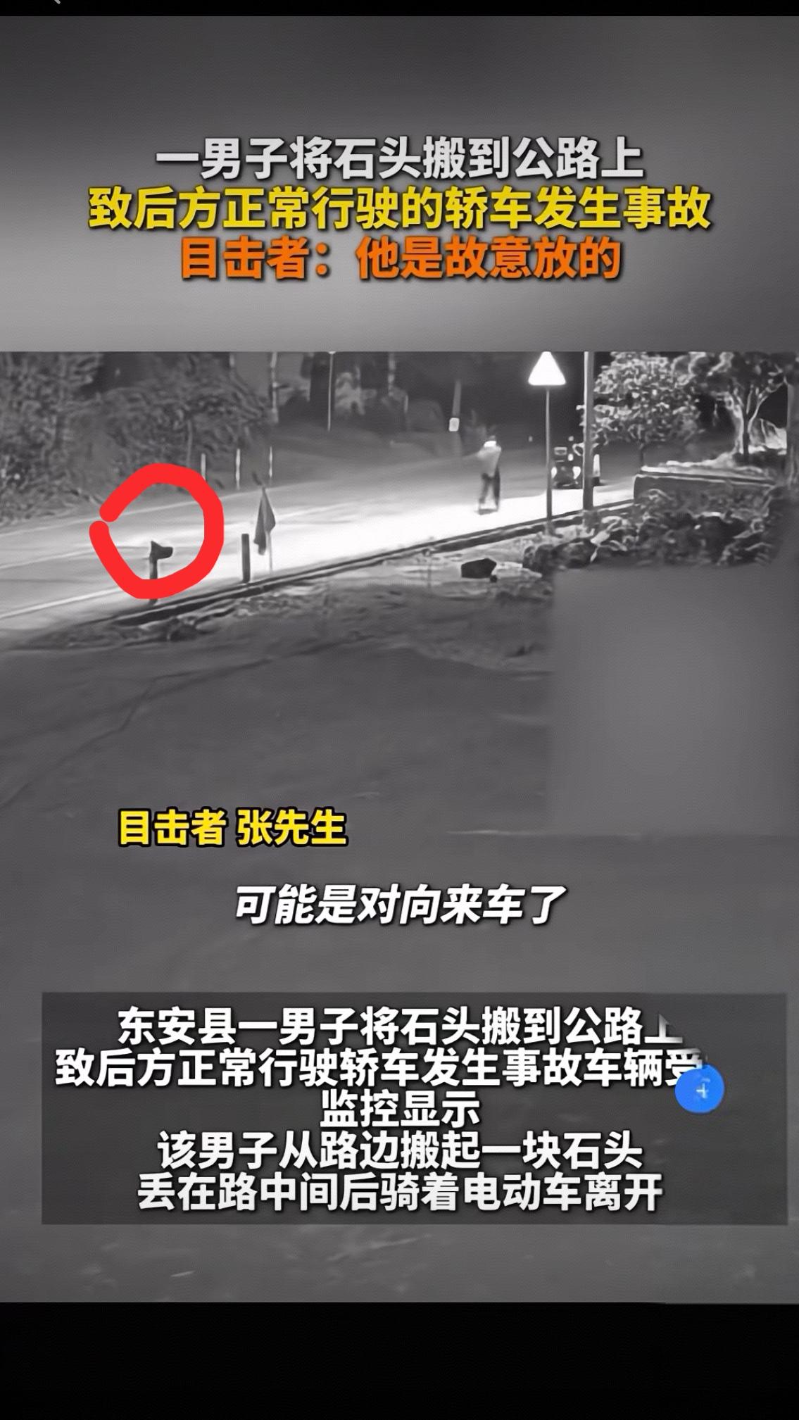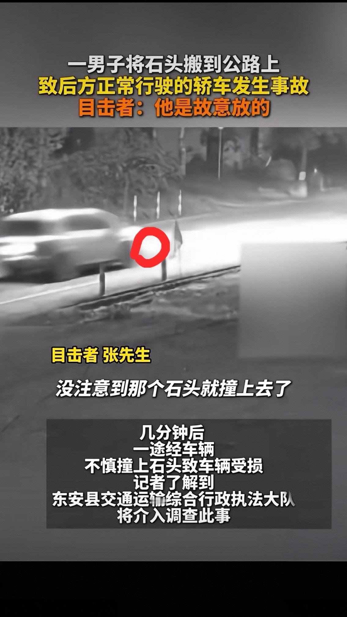 一块石头,砸出人性最丑陋的一面! 东安县一条普通公路上,监控拍下了令人脊背发凉的一幕:一名男子慢悠悠从路边搬起一块沉甸甸的石头,看了看四周,然后毫不犹豫地将石头丢在路中间,随即骑上电动车扬长而去。 没过多久,一辆轿车沿着公路正常行驶,根本没料到前方会突然出现障碍物。随着一声刺耳的刹车声,轿车狠狠撞上石头,车身瞬间失控,剐蹭着路边护栏停下,车头凹陷、零件散落一地,万幸的是驾驶员只是受了轻伤。 目击者气愤地表示,男子全程动作从容,明显是故意为之! 一块石头,不足百斤,却压垮了做人的底线。我们不敢想象,如果当时经过的是一辆高速行驶的摩托车?如果是一辆载着孩子的校车?后果不堪设想! 是什么样的心态,能让一个人对素不相识的陌生人下此狠手?是生活不顺迁怒于人?还是心存恶念以他人的危险取乐? 要知道,公路不是私人泄愤的场所,每一个恶意的举动,都可能夺走一条鲜活的生命、毁掉一个幸福的家庭。 这件事也给所有司机敲响警钟:行车途中务必集中注意力,遇到不明障碍物及时避让;更要提醒身边人,路见不平及时报警,别让冷漠纵容了恶。 目前,警方已经介入调查,我们期待能早日查到这名男子,让他为自己的恶行付出应有的代价! 评论区聊聊:如果你在路上看到有人故意放置障碍物,你会怎么做?