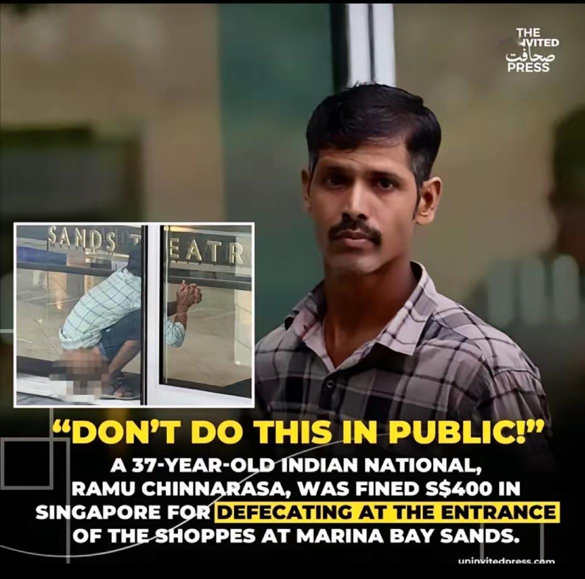 37岁印度籍男子在新加坡滨海湾金沙商场入口直接排便,最后被罚款400新元(大概人民币2200多)。 说真的金沙作为地标性商场,人来人往的,这操作实在让人难以理解。新加坡对公共卫生管得超严,之前就听说过公厕不冲水都要罚150新元,更别说这种公共场所的不文明行为了,400新元罚款已经算严厉的惩戒了。 我认为老居民应该多包容一下“新移民”,毕竟你们的总理也是“新移民”种族的[耶]这种事件以后只会越来越多,现在多习惯一下就好了[大笑]