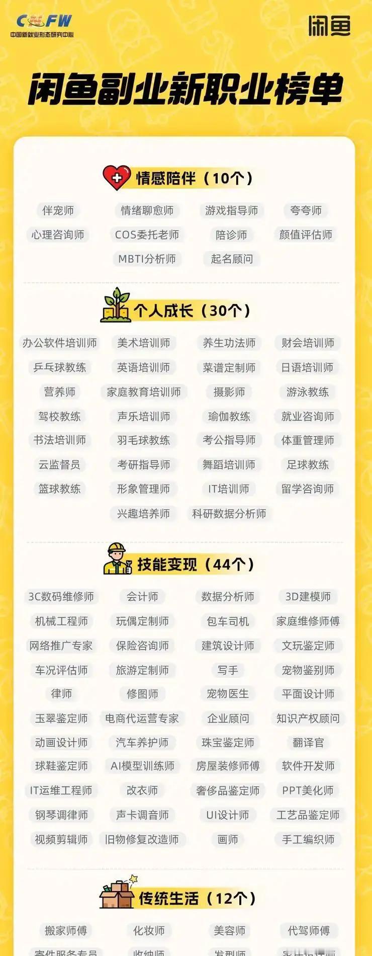 1962万年轻人闲鱼偷偷赚钱,有人把副业干成主业,5个职业被点名! 今天看到一个消费报告,大开眼界。原来现在的年轻人早就不执着于铁饭碗了,一大波人悄悄在闲鱼开辟搞钱新赛道,玩出了就业新花样。 12月26日发布的报告显示,过去一年有1962万名卖家在闲鱼靠技能服务掘金,00后占比高达41%,95后、90后合计占33%,高学历青年更是副业大军里的活跃分子,从业者人均年收入能达4317元。 你肯定好奇他们到底在捣鼓啥?数据给出答案:超41%的人副业收入占月收入三成以上,三成从业者每周投入30小时,堪比全职兼职,近八成还计划把副业升级成自由职业或创业项目。 更有意思的是,闲鱼的消费风向早变了,不再是二手杂货铺。个人成长、情感陪伴、技能变现三大新方向订单增速全超100%,考研指导师、云监督员、情绪聊愈师这些新职业火出天际。 报告还从96个新职业里,遴选出陪诊师、伴宠师、体重管理师、情绪聊愈师、就业咨询师这5个最有潜力纳入《国家职业分类大典》的香饽饽。就说陪诊师,赶上老龄化浪潮,需求简直是蹭蹭涨。 如果你担心这些副业不长久?报告早就划好了重点:高校可将副业工时折算成实习学分,还能开发补贴短训课程;成熟新职业有望纳入国家职业分类,线上副业创业也能纳入青年创业支持项目。 从挤破头抢铁饭碗到玩转多元副业,年轻人的就业观彻底变了,闲鱼这类平台,正成了他们实现自我价值的新舞台。
