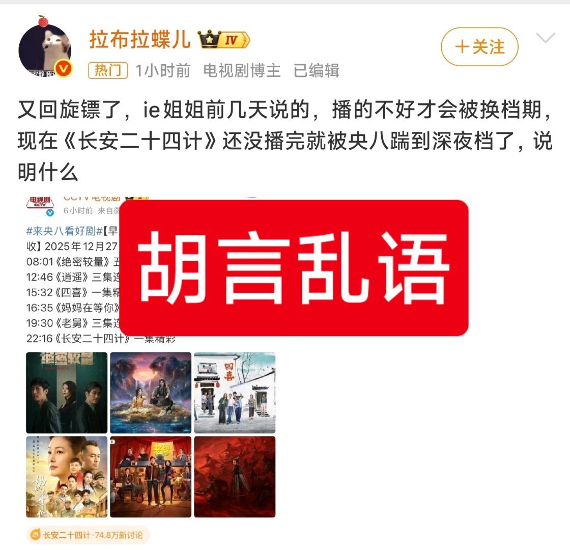他嘴里有真话吗?人家《长安二十四计》因为周末所以才播一集的,还是次黄档,他却说深夜档!昨天CVB前30没有他家,破防了?