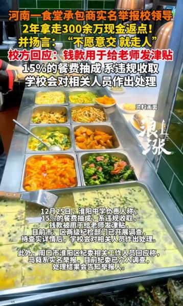 “必须严惩!”河南一女子承包学校食堂,学生每天20元餐费,她本以为有钱可赚,结果,学校领导却让她每年支付餐费的4.5%,作为管理费,女子也没多想,可谁知,学校领导竟然又单方面将管理费涨至15%,仅仅2年,校领导就从她这拿了330多万返点,女子选择实名举报校领导。 “必须严惩!”最近河南周口一起学校食堂承包纠纷,看得人火冒三丈。 事情得从2021年9月说起,当时马蕤的公司和淮阳中学签了3年的食堂经营委托管理合同,承包的是该校初中部也就是淮阳人民中学的食堂,负责全校师生三餐。 合同里写得明明白白,每年只要交营业额的4.5%作为管理费就行,这所学校是全封闭式管理,大概有3000名学生,每个学生每天餐费20元,马蕤当时想着按这个规模,好好经营总能有钱可赚,也就没多想,安心投入运营。 第一年合作还算顺利,校方也是按照合同约定,从学生餐费里扣除4.5%的管理费后,再把剩下的钱转给马蕤。 可没想到,2022年9月开学没多久,校领导突然找过来,直接通知她管理费要涨到15%,态度强硬得很,撂下一句“不愿意交,就走人”。 说白了,马蕤的公司前期已经投入了不少成本,要是这时候退出,之前的投入就全打了水漂,没办法,她只能被迫接受这个高出合同约定3倍多的抽成。 更让人不舒服的是,收费方式也变了,之后学校派驻初中部的后勤部主任石某,会先把核算好的全部餐费转给马蕤,再让她取出现金,把其中15%的部分返还回去。 马蕤保存的微信聊天截图能清楚看到,有一次石某把餐费核算单拍照发她,让她第二天取走红笔圈出的67万多块钱,那正是15%的返点加上之前没结清的金额。 就这样从2022年9月到2024年7月,两年时间里,马蕤至少5次取出现金,累计330多万交给石某或他指定的人。 前两次是直接交给石某,后面三次更夸张,石某带着另一个男人,在银行柜台就把取出来的钱直接存进了对方个人账户。 长期被这样压榨,马蕤实在扛不住了,今年12月24日,她直接向周口市淮阳区纪委实名举报了这件事。 面对质疑,淮阳中学现任党委书记徐良回应说,15%的抽成确实是违规收取的,还说这笔钱被用来给老师发津贴了。 目前市、区两级纪委已经介入调查,学校也在配合,之后淮阳区政府也发布了通报,明确责成纪委监委、教体局组成联合调查组,尽快查清事实依法处理。 其实了解政策的都知道,2022年7月财政部和教育部就联合发文,明确中小学校食堂要坚持公益性和非营利性原则,当年10月七部门也要求,学生伙食费必须全部用于供餐成本开支。 这么看的话,不管这笔钱是不是真的发了津贴,这种从学生餐费里抽成的行为,本身就违反了规定。 330多万可不是小数目,全是学生家长一分一厘交的餐费,本应用在孩子的伙食上,改善就餐质量,结果却成了某些人的“额外收入”。 家长们交着20元一天的餐费,是想让孩子吃好点,可这样的抽成会不会影响饭菜质量?想想都让人担心。 现在大家最关心的,就是调查组能不能把事情查清楚,330多万的去向要一一核实,涉及的相关人员也要依法追责,毕竟学校是教书育人的地方,不能让这种歪风邪气坏了风气。 对此你有什么不同的看法,可以在评论区留言讨论!!!