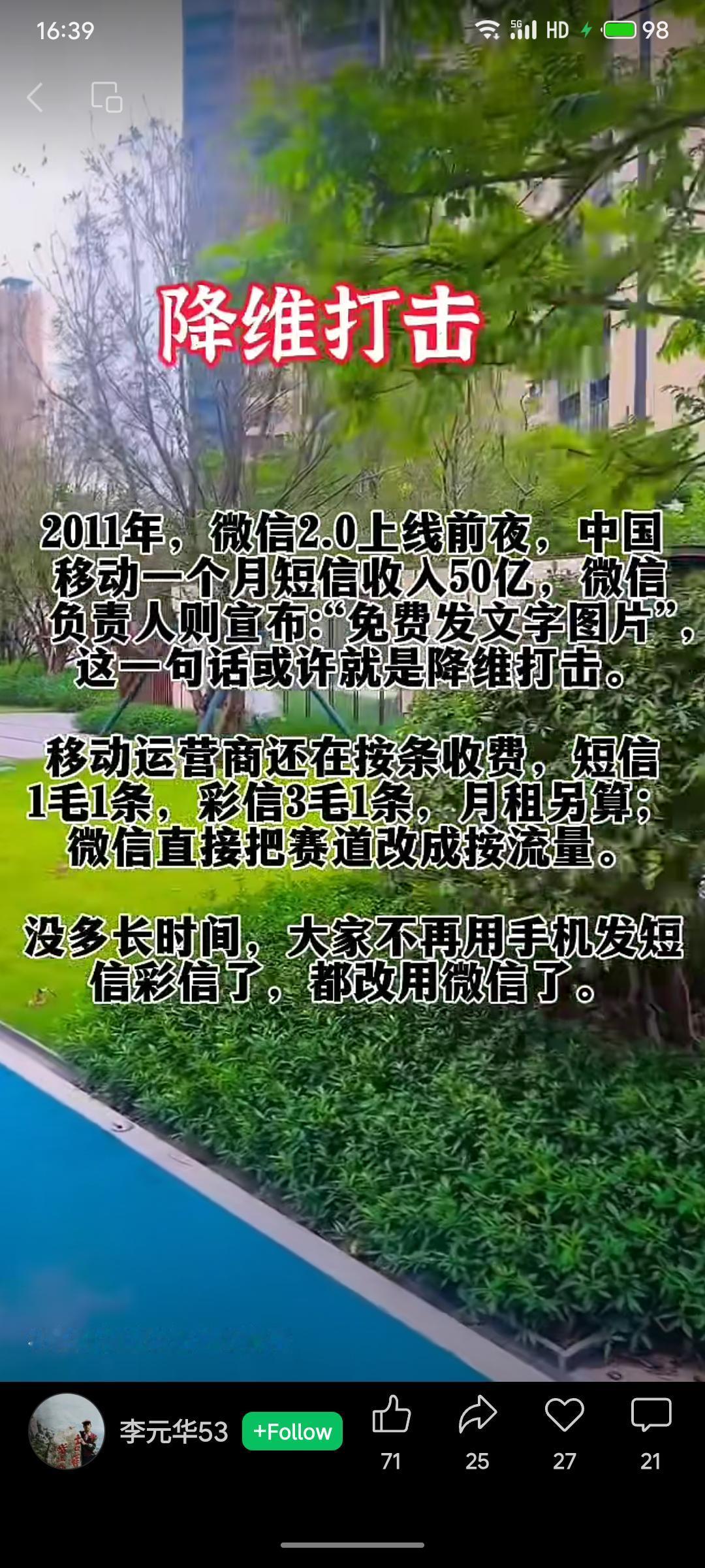 2011年,微信2.0上线前宣布免费发送文字图片,直接冲击了当时中国移动月入50亿的按条收费短信业务。用户迅速转向微信,以流量模式取代传统计费,完成对运营商的“降维打击”。