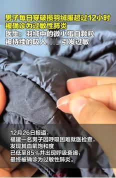 “悲剧还是发生了!”近日,福建,一男子低价网购了件羽绒服,每天穿着超过12小时,破了也不舍得扔,一个月后,他感觉自己喘不上气,就医后发现呼吸衰竭,差点危及生命!而病因,就是他每天穿的那件羽绒服!网友:太吓人了! “你这个病主要是因为你穿的那个衣服,以后可得多注意点。”医生这一句话,把男子彻底说懵了。 前阵子天气转冷,男子在网上买了一件羽绒服,价格低得离谱,比商场便宜一大截,虽然衣服说不上多好,但也确实能保暖。因此哪怕衣服的内衬破损,时不时有白色的绒絮钻出来,男子也只是拍了拍,掸一掸,继续穿。 可一个月过去,问题慢慢出现了。 一开始男子只是觉得累,胸口发紧,像压了块石头。他以为是熬夜多了、缺乏运动,也没太当回事。再后来,情况越来越不对劲,晚上躺下总觉得吸不进气,深呼吸时胸腔隐隐作痛,咳嗽却咳不出什么。 家里人劝他去医院看看,他还嘴硬:“哪有那么娇气,估计感冒了。”直到有一天,他突然觉得眼前发黑,呼吸急促,整个人像被掐住了喉咙,这才急忙了医院。 检查结果出来,医生脸色一下就严肃了:过敏性肺炎,必须立刻住院。 医生详细询问了他的生活习惯,从饮食、居住环境,一直问到最近穿的、用的东西。男子随口提了一句那件便宜羽绒服,没想到医生立刻追问细节,让他把衣服拿来看看。 衣服一到,问题一目了然。 羽绒服内衬多处破损,只要稍微活动,细小的羽绒纤维就会从缝隙里飘出来。这些看起来不起眼的绒毛,其实含有大量微小的蛋白颗粒。每天长时间穿在身上,呼吸时,这些肉眼几乎看不见的颗粒就会被不断吸入肺部,直接进入肺泡。 医生说得很直白:这种吸入是持续性的,不是一口两口的问题。时间一长,肺部会产生强烈免疫反应,就算以前从来没有过敏史的人,也可能中招。 这不是“衣服脏不脏”的问题,而是“吸进肺里”的问题。 消息传到网上后,评论区瞬间炸锅,谁能想到,一件衣服能把人穿进医院?还有懂行的网友提醒,很多廉价羽绒服填充物来源不明,加工工艺不过关,一旦破损,风险就成倍放大。 医生后来总结得很现实:过敏性肺炎并不罕见,但被一件日常穿着的羽绒服诱发,很多人根本想不到。尤其是长时间穿着、贴身、密闭环境下,风险会被不断放大。 所以说,省钱本身没错,但拿健康去赌,从来都不划算。有些东西,看似只是穿在身上,实际上却会直接影响到你体内的健康。 信息来源: 光明网丨每天穿破损羽绒服,男子确诊肺炎!医生提醒 文丨小王 编辑丨史叔