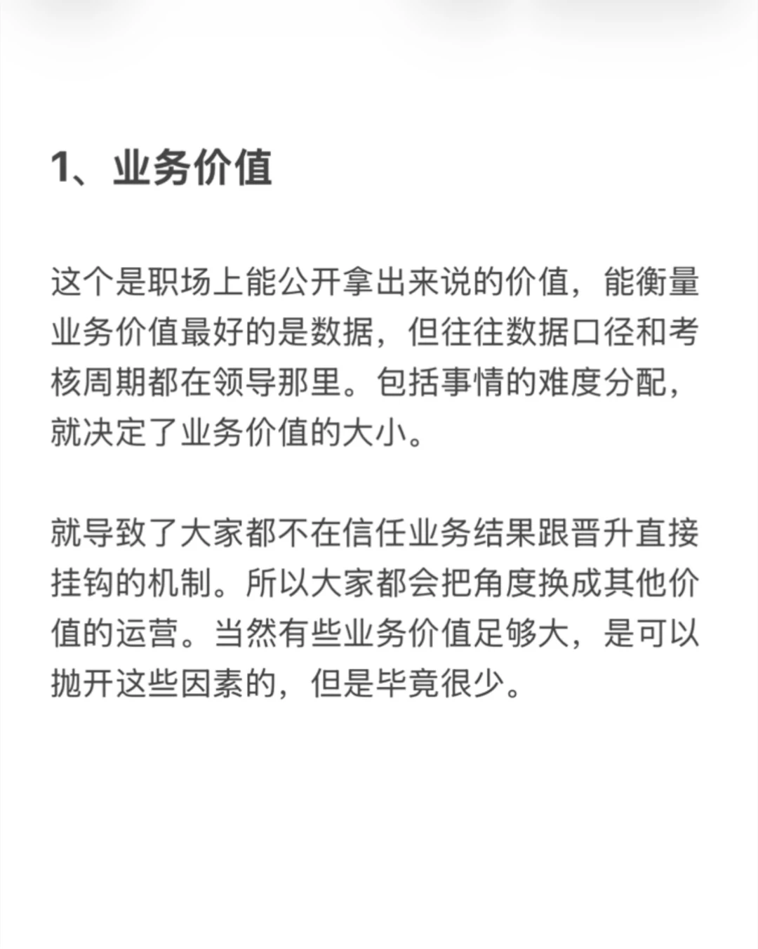 绝对的超出预期的业务价值 互补的资源价值 以及情绪价值 总得有一个 否则那种觉得自己干的不错的,没有经营的,其实很难晋升 互联网大厂 小L的职场观察 晋升 互联网 职场竞争力 职场干货 职场那些事儿 职场日常 价值交换是人际关系的本质