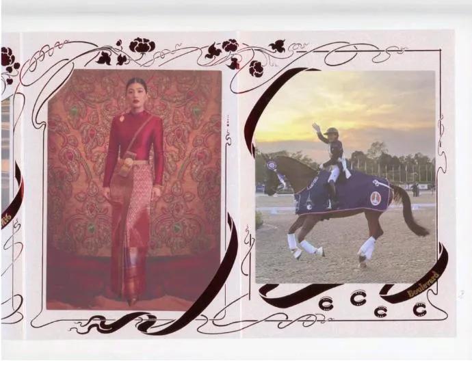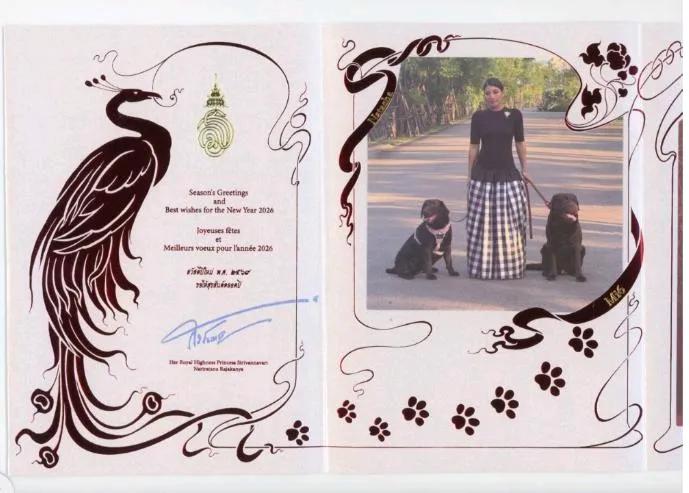 元旦快到了,护国神兽公主思蕊梵率先发了新春祝福卡片,表达了对2026年新的一年的美好期许。 卡片上是神兽公主的专属孔雀徽章,彰显着身份的高贵。 思蕊梵晒出三张照片。 一张算是生活照,思蕊梵黑衣格裙拉着两条大黑狗站在大路上。 一张思蕊梵穿着泰式服饰,高贵喜庆。 一张是思蕊梵在骑马,凸显了公主的时尚和高雅趣味。 思蕊梵是幸运的,母亲余瓦达生下5个孩子,原本重男轻女,觉得几个儿子里面备不住有泰王的继承人,谁想儿子们都被扫地出门,反而思蕊梵被宝贝似的接回宫,成了护国神兽公主,这人生际遇,简直不要太好!