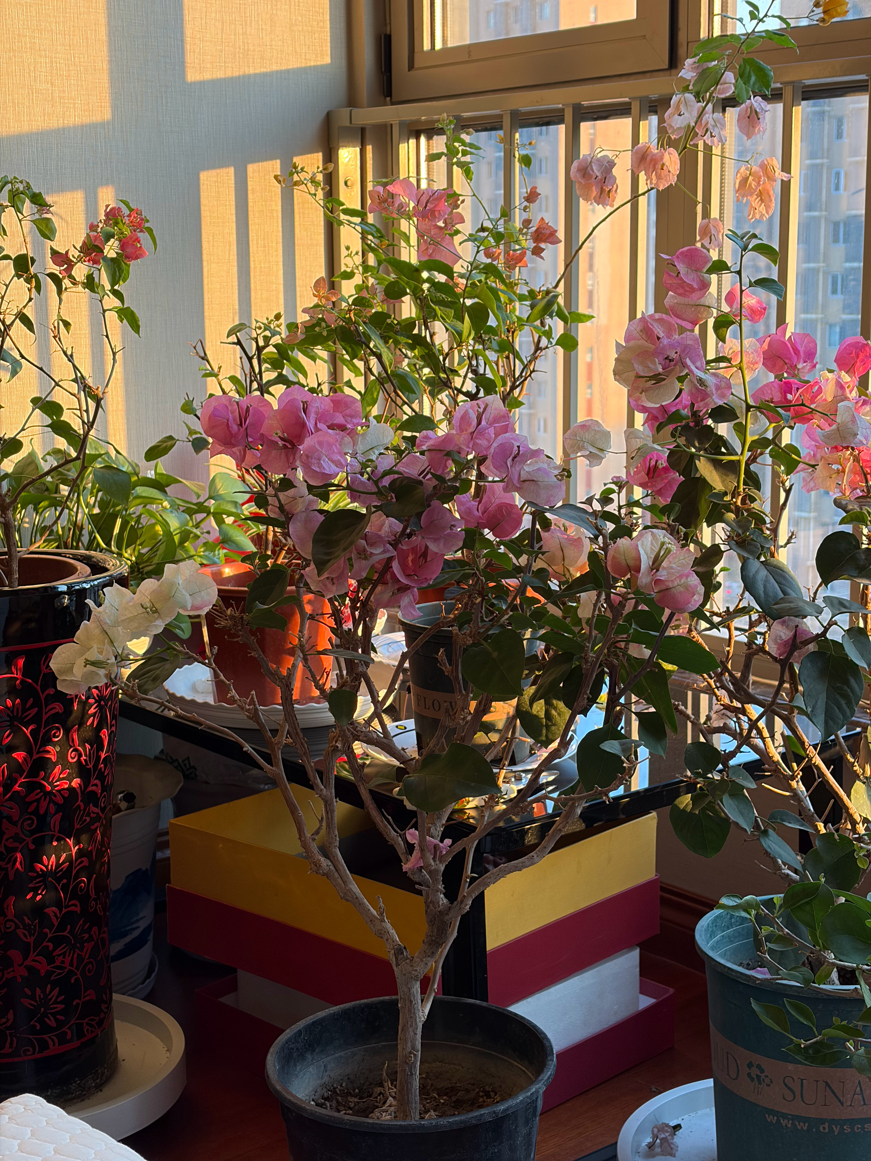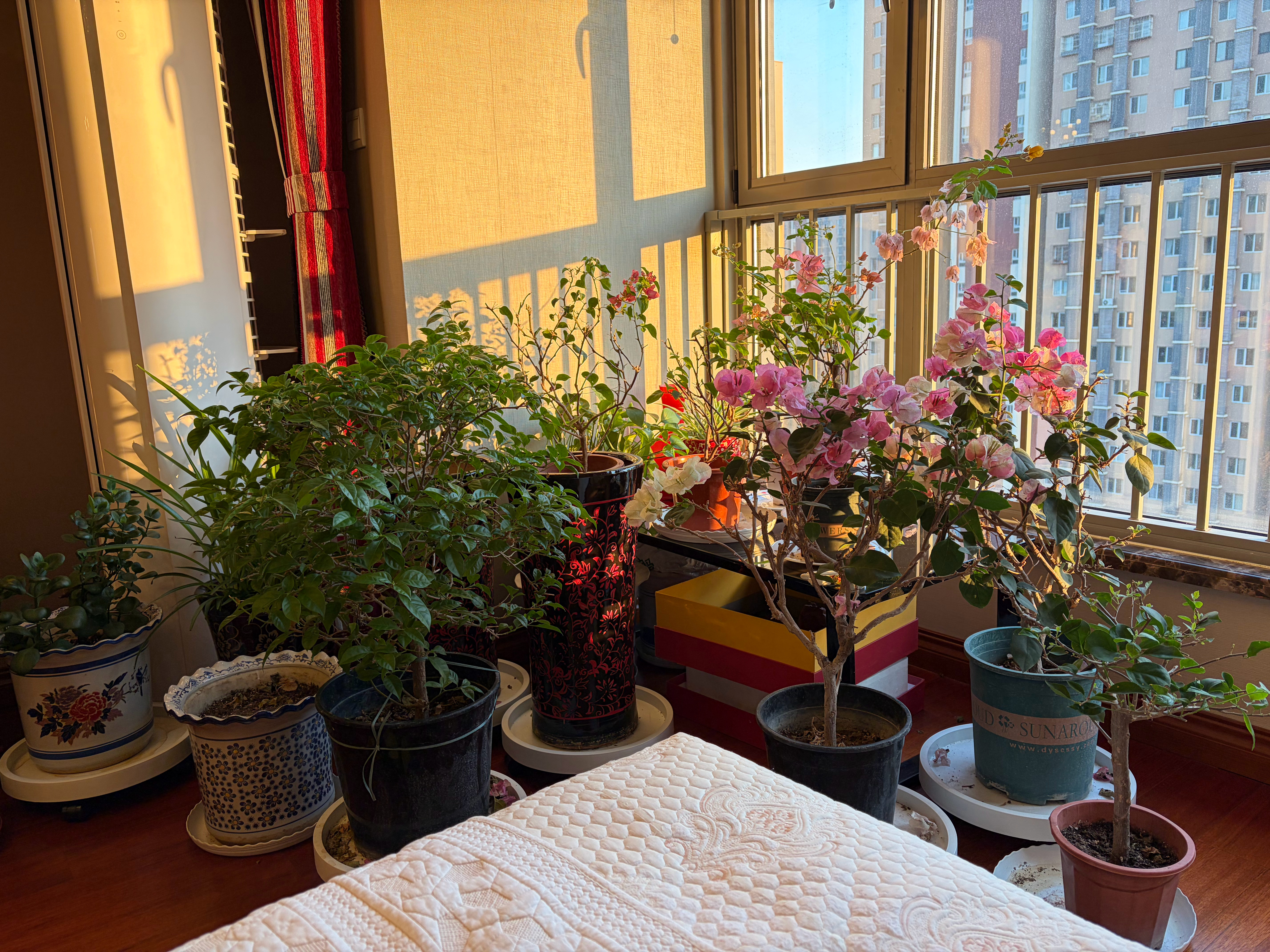 我爸妈家十一楼,地暖又特别足,室内 26 度,得穿短袖短裤。家里甚至可以种三角梅我妈说这是南方的花,北京户外养不了,就家里暖和才能养。为了养这个花她特意在网上学了好多养花知识,买了好多肥料和药,实验了好几个月,终于给养活了开的贼好看~