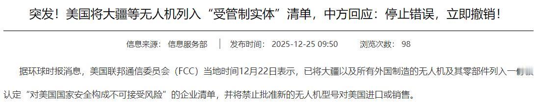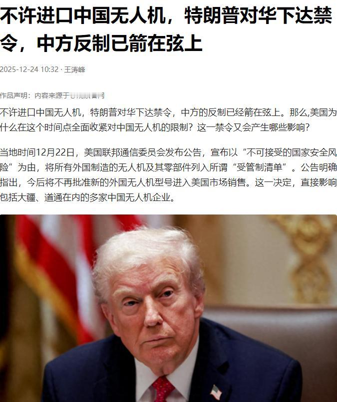 中国不欢迎他。 中国坚决不要特朗普访华。对于这些出尔反尔的人,坚决不要给他们脸。韩国见面的话还没凉,手还没松。转头就把制裁大棒砸向了大疆的行业级无人机,不准美国企业、机构采购,理由还是老掉牙的 “国家安全”。 这波操作有多离谱,看看时间线就懂了,2025年8月25日,特朗普在白宫与韩国总统李在明会晤,双方看似“融洽”,谈及经贸、能源及半岛问题并释放“积极沟通”信号。 可这场会面热度未褪四个月,特朗普政府就突然调转枪口,将制裁大棒挥向中国大疆,针对其行业级无人机禁止美企、机构采购,理由仍是被用滥的“国家安全”。 这种前脚寒暄后脚打压的操作,不仅国际社会费解,美国本土不少用户也觉得离谱。 梳理时间线便知,这绝非临时起意,而是蓄谋已久的打压。2017年,美国国防部就无端将大疆列入制裁清单,污蔑其可能向中方提供数据;2024年,美众议院通过《2025财年国防授权法》时,专门加入针对中国无人机的条款。 2025年7月,特朗普签署行政命令,借“扶持本土产业”之名,指示商务部调查“外国无人机供应链”,为打压铺路。 8月的韩美会晤不过是缓兵之计,12月22日,美国联邦通信委员会(FCC)正式出手,将包括大疆在内的外国无人机及零部件列入“受管制清单”,彻底禁止新机型进入美市场。 美国的制裁理由更是站不住脚。FCC主席宣称外国无人机可能被“武器化”,还拿未来大型活动炒作“潜在威胁”;部分共和党议员更是无端宣称中国会用无人机“测绘美领土”,威胁关键资产安全。 但事实是,大疆作为全球民用无人机领军企业,产品安全性早已获全球市场和第三方机构验证,广泛应用于农业、消防等民生领域,所谓“安全威胁”纯属无稽之谈。 说到底,美国政府的真实目的根本不是什么“国家安全”,而是怕中国无人机产业的优势太大,挤掉了美国本土企业的生存空间。 有数据摆在那,全球70%-80%的商用无人机都来自中国,单说美国市场,大疆的份额常年霸占半壁江山,在一些细分领域更是逼近90%的垄断水平。美国本土的无人机企业在技术、性能、价格和生态体系上,短期内根本无法替代大疆。 这种行业差距带来的焦虑,让美国政府急得跳脚,只能放弃所谓的“自由市场”原则,用行政手段搞“霸权式打压”。 就像佛罗里达州参议员里克·斯科特直言不讳的那样,这次制裁就是“把中国无人机逐出美国市场、支持本土制造商的重大进展”,一句话暴露了其贸易保护的真实嘴脸。 这种“伤敌八百自损一千”的操作,最先坑了美国自身。FCC禁令虽允许存量无人机使用,但新机型无法入市,这让依赖大疆高性价比产品的美地方政府、执法部门及商业用户陷入困境。 美国现有超100万架合法运营无人机、近50万名持证使用者依赖相关设备,禁令已引发国内大量抗议。 美方虽计划投11亿美元扶持本土产业,试图2027年前实现替代,但行业代差短期内无法弥补,最终成本仍由美国消费者和企业承担。 面对无理打压,中方与大疆回应克制且坚定。大疆次日声明对美方决定表示遗憾,指出其破坏开放市场环境,并将维护自身及用户权益;中国驻美使馆和外交部发言人先后表态,坚决反对美方泛化国家安全概念、打压中国企业,要求美方纠正错误。 特朗普政府这种出尔反尔的风格,只会不断损耗美国国际信誉,如此反复无常,何来信任可言? 这也是为什么我们说“中国不欢迎特朗普访华”。对于这种毫无诚信、出尔反尔的政客,根本没必要给脸。 国与国之间的交往,最基本的原则就是诚信互利,而特朗普政府显然把“利益优先”凌驾于一切规则之上,只要符合自己的政治和经济目的,随时可以撕毁共识、挥舞制裁大棒。 这次制裁大疆,不过是中美科技博弈中的一个缩影,美国想通过打压中国优势产业来遏制中国发展,但历史已经多次证明,这种霸权主义的打压根本挡不住中国企业的崛起。 大疆在全球无人机领域的地位,是靠技术创新和市场认可换来的,不是美国一道禁令就能撼动的。 而特朗普政府的这种操作,最终只会让自己在国际社会越来越孤立,让美国本土用户为其错误决策买单。 信息来源:1. 人民日报:《外交部回应美方将大疆无人机列入“受管制清单”:坚决反对无理打压中国企业》 2. 观察者网:《美国全面禁售外国无人机,还污蔑“中方会测绘美国每一寸土地”》 3. 中国网:《拉黑大疆,谁先破防》 4. 浙江省贸促会:《突发!美国将大疆等无人机列入“受管制实体”清单,中方回应:停止错误,立即撤销!》