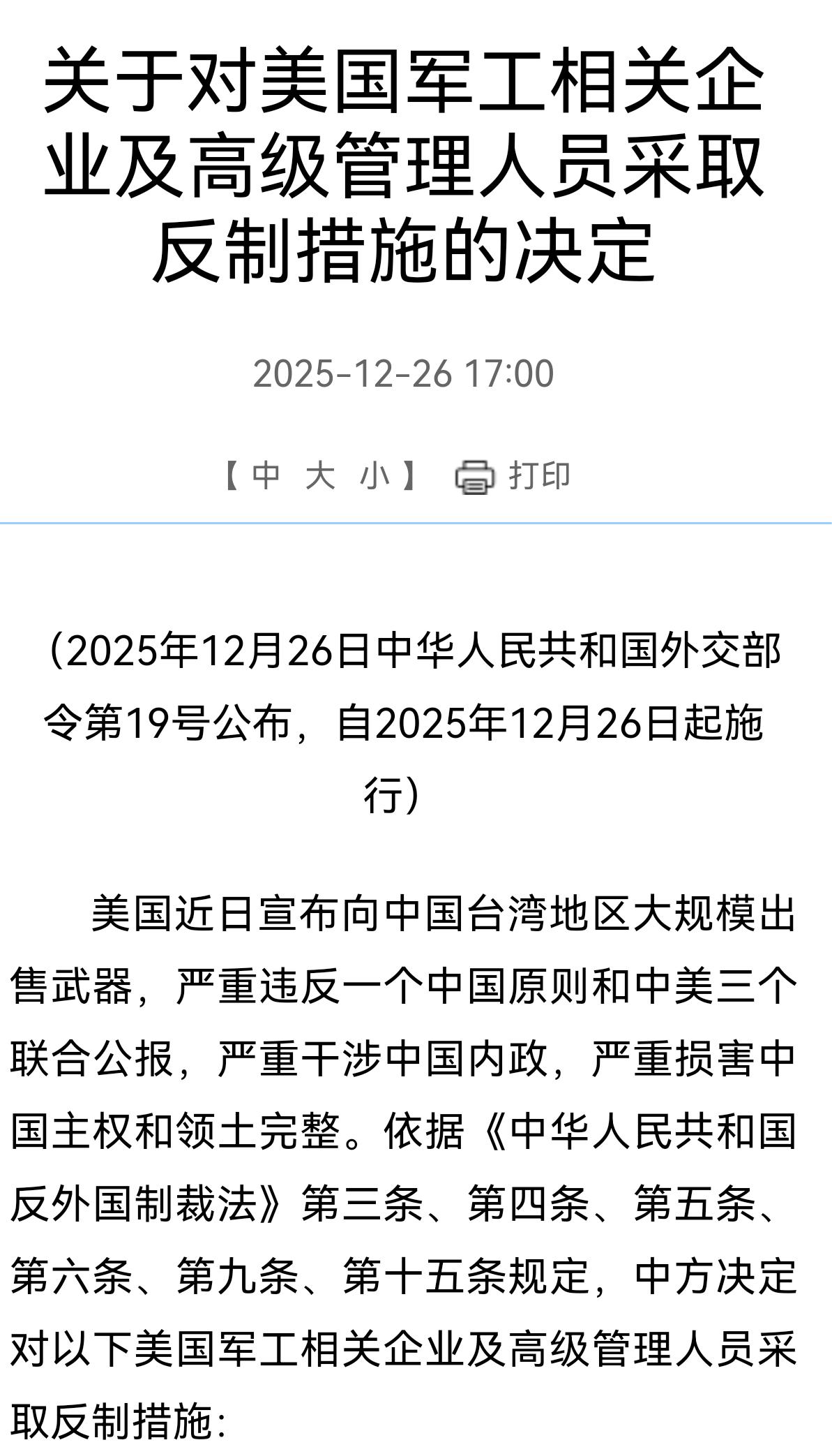 111亿美元军售?中国打出西半球“王牌”反制 根据新华社等多家媒体报道,美国12月18日批准向台湾地区出售111亿美元的史上最大军售方案。对此我们表示强烈不满,解放军报以《“以武谋独”痴心妄想 倒行逆施必食恶果》对美方行为进行批评。 12月26日,中国外交部宣布对包括诺斯罗普·格鲁曼系统公司、L3哈里斯海事服务公司、吉布斯与考克斯公司等20家美国军工企业,以及对帕尔默·卢基、约翰·坎蒂伦、迈克尔·卡诺维尔等10名企业高级管理人员采取反制措施。 一直以来,台湾始终是美国试图遏制中国发展、影响中国实现统一进程的重要底牌。 2025年的美国国防安全战略文件也明确指出,维持当前台海局势是其重要的战略构想。任何试图打破当前平衡的行为,都将遭到美方采取强烈措施的应对。 多年以来,对台军售是“台湾牌”的一个重要手段。不过今非昔比,过去对美国而言屡试不爽的方法,随着中国大陆实力的逐步增强、经济的迅速崛起和军事的不断突破,这张牌的影响力也越来越小。 美国彭博社认为,以上被制裁的20家企业和10名高管与中方实际业务并不多,此次制裁更多的是对“美对台最大单笔军售所触碰红线”表达的愤怒。在其看来,制裁似乎只是望洋兴叹,无法对其进行实质性的打击。 虽然以上企业和人员与中方实际业务不多,但是这并不表示中方的制裁不会对其产生任何影响。尤其是美国长期以来制造业空心化带来的供应链单一、涉军工产业重要矿产资源的短板,以及大陆市场的巨大潜力,对其而言均会带来重要影响。 它有张良计,咱有过墙梯。结合当前美国把重心转移至西半球,我们同样可以采取与其同样的策略,大打“委内瑞拉牌”。 事实是,当前的美国纸面上来看仍是世界第一强国,但其全球影响力已逐渐衰弱。随着特朗普政府战略的调整,西半球的地位在其战略架构中变得越来越重要。这也是特朗普本人及其幕僚多次公开谈论的话题。 当前,美国正对委内瑞拉政府采取极限施压,试图通过强大的军事压力迫使委内瑞拉政府妥协,从而扭转其与美国政府步调不一致的政治生态,并为美国财阀进入委内瑞拉获取石油资源创造条件。以低价石油来稳固国内高负债和通胀问题,也可以在西半球地区形成以儆效尤的战略威慑作用,成为美国西半球“战略部署战”的一次成功案例。 面对美方在台问题上的不听劝告,反而以军售案拱火台海事态,我们完全可以以彼之道、还施彼身,采取各种措施来帮助委内瑞拉化解此次美国威胁。 当前,委内瑞拉在军事和经济方面与美国相比劣势明显,难以抵挡美国军事威胁。 根据中国海关相关数据,中国是委内瑞拉最大的经济投资国和石油输出国。经济贷款约600亿美元,石油出口占90%。 如果我们能够与委内瑞拉进行更多经济合作,帮助其推动石油开发、稳定国内货币和通胀、提高就业,甚至为其在相关框架内提供军售支持,那么就能有效平衡美国对委内瑞拉的战略威胁,以及美国试图通过“台湾牌”给我们制造的麻烦。 近日,我国外长、驻联合国代表也多次强调支持“委内瑞拉反对单边霸凌行为和对他国主权的侵犯”。委方也喊话表示希望我们提供先进雷达。 虽然我国在外交上奉行独立自主、尊重他国主权的原则,但面对美国的霸权和不公挑衅,作为世界第二大经济体和军事强国,我们可以更加积极主动地承担更多国际责任,为全球安全稳定贡献更多力量。
