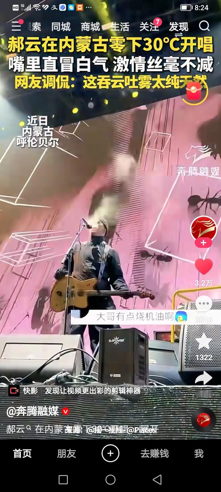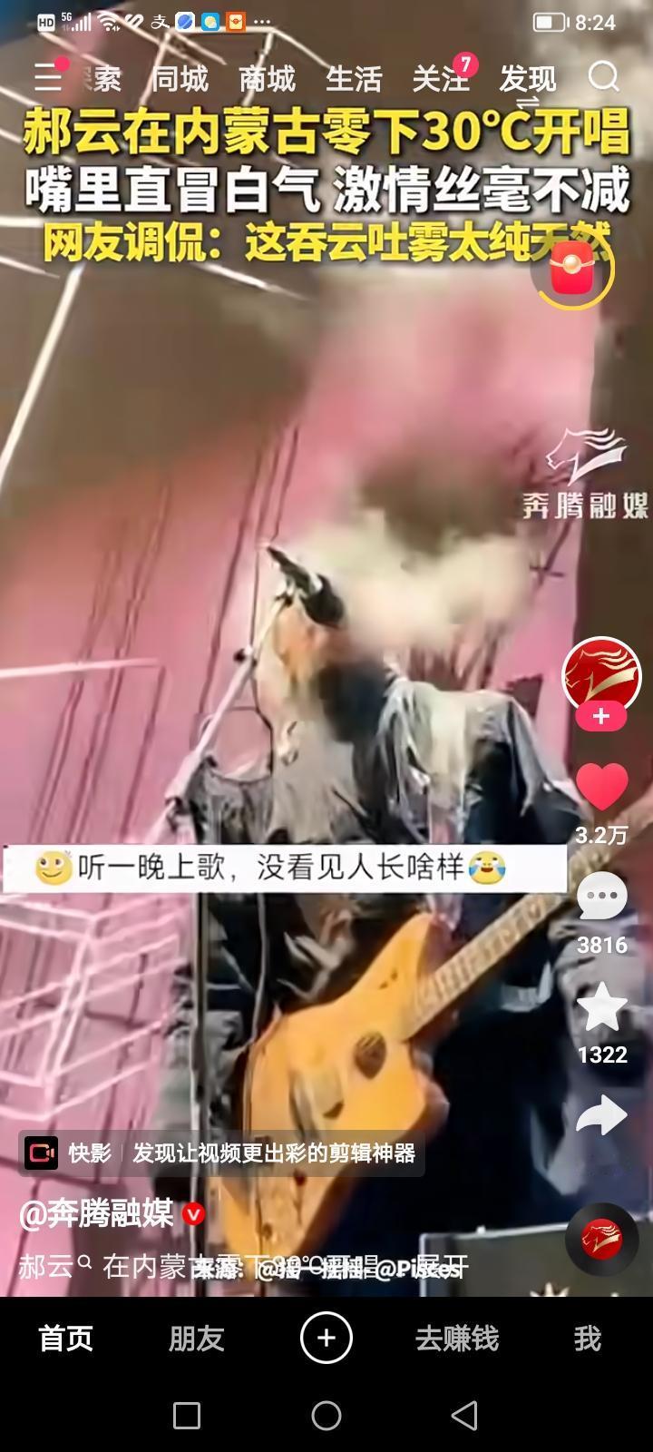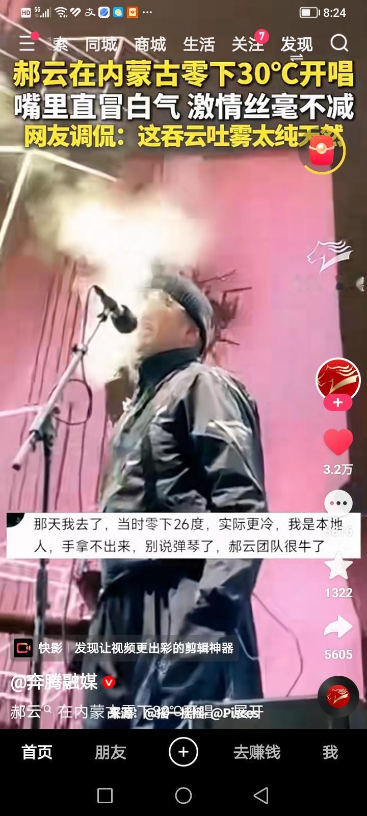 看到一位歌手叫郝云,在内蒙古开演唱会,那一张囗往外冒白烟的,真的看着就忍不住的笑,内蒙古那边现在零下30度气温,确实只要你一张嘴,那就是不停的往外冒白烟。(图片信息来源:奔腾融媒)史可郝云 演唱会 内蒙古 唱歌