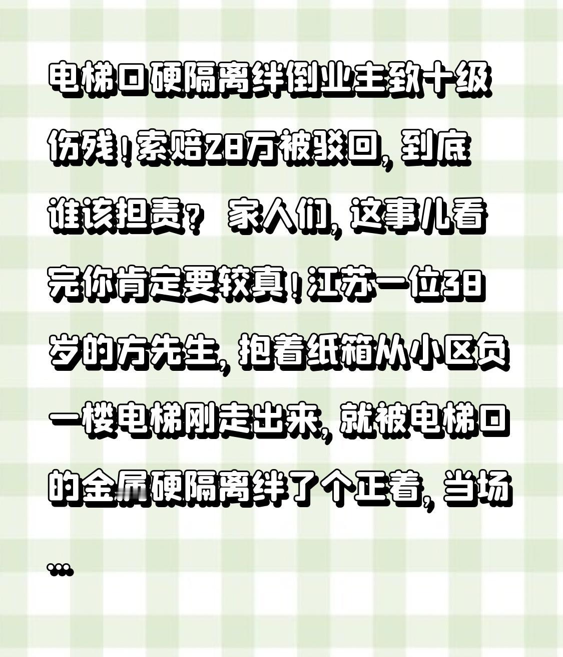电梯口硬隔离绊倒业主致十级伤残!索赔28万被驳回,到底谁该担责? 家人们,这事儿看完你肯定要较真!江苏一位38岁的方先生,抱着纸箱从小区负一楼电梯刚走出来,就被电梯口的金属硬隔离绊了个正着,当场摔成左股骨颈骨折,最后鉴定为十级伤残,可起诉物业索赔28万却被法院驳回,这反转也太让人意外了! 2024年4月的一个晚上,方先生像往常一样抱着杂物下楼,电梯门一开,脚刚迈出去就撞上了一个高约50厘米的金属阻挡器。他说这东西离电梯口才二三十厘米,高度快到膝盖,加上电梯内外光线有差异,眼睛还没适应就被绊倒了。后续治疗花了不少钱,落下的伤残更是影响一辈子,他认为物业设置的硬隔离位置不合理,理应承担责任。 本以为是物业管理疏忽,没想到转折点来了——物业的辩解让整个事件变了性质。物业说,安装硬隔离根本不是擅自决定,2024年南京发生电动自行车火灾事故后,街办专门开会要求小区加装硬隔离,杜绝电动车上楼充电,而且业主委员会也开了会同意这项决议。安装前贴了通知,安装后还在电梯里贴了“注意脚下”的提醒,已经尽到了告知义务。 更关键的是法院的判决:经过现场勘验,负一楼有声控灯,电梯内光线充足,不存在需要适应光线的情况,方先生摔倒主要是因为怀里的纸箱阻挡了视线,自己疏于观察。法院认为硬隔离是为了保护全体业主的生命财产安全,设置有正当性和合理性,所以驳回了他的索赔请求。不过物业出于同情,主动提出补偿2.8万元,但方先生无法接受,已经提起上诉。 这事儿一出来,网友们吵翻了天:有人说物业没毛病,电动车上楼充电太危险,硬隔离是为了大家安全;也有人觉得硬隔离设置在电梯口确实不合理,50厘米的高度很容易绊倒人,尤其是抱着东西或者老人小孩经过时。其实类似的小区安全隐患不少,比如消防通道被占、高空抛物等,都是悬在业主头顶的“达摩克利斯之剑”。 说到底,这起悲剧没有绝对的赢家。方先生落下终身伤残,物业也陷入纠纷,而核心矛盾其实是“公共安全”和“个体便利”的平衡。物业在执行安全规定时,是不是可以把硬隔离做得更醒目,比如刷上反光漆、加装警示灯?业主出行时,也该多留意脚下环境,避免意外发生。 小区是大家的家,安全需要每个人共同维护。不管上诉结果如何,这事儿都给所有小区提了个醒:安全措施不能只讲“合规”,更要兼顾“人性化”,毕竟真正的安全,是既防住风险,也护好每一位业主的出行平安。 你觉得法院的判决合理吗?你小区有没有类似的安全隐患?