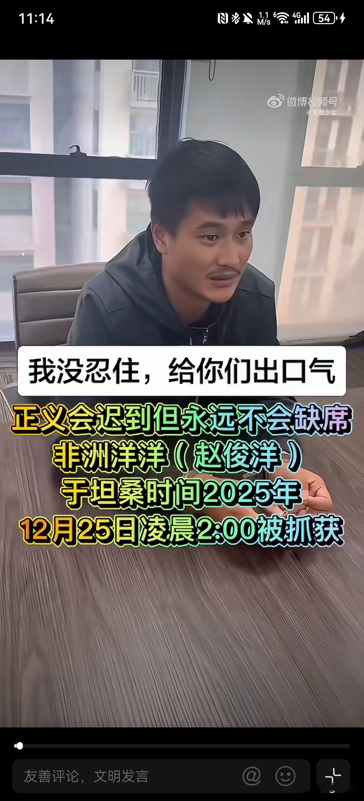 网红“非洲洋洋”坦桑尼亚绑架殴打同胞落网!面临双重法律制裁 中国短视频博主“非洲洋洋”(本名赵俊洋,河南沈丘人)在坦桑尼亚涉嫌绑架、虐待同胞被当地警方抓获。 赵俊洋常年在非洲拍摄原始部落生活吸粉,2025年11月以“合作拍摄稀缺素材”为由,将贵州博主曾凡贵(网名“曾舒记管家婆”)诱骗至坦桑尼亚。拍摄结束后,赵俊洋突然翻脸,收缴曾凡贵手机、护照,强行要求其参与诈骗国内企业家的非法活动,遭到曾凡贵坚决拒绝。 在随后的7天里,赵俊洋对曾凡贵实施非法拘禁,多次用辣椒水、电棍、棍棒等工具施暴,致其双腿开放性骨折、肋骨三处断裂,体表布满电击灼伤痕迹,还趁机转走其银行账户1.8万余元。危急时刻,曾凡贵在被转移途中趁车辆加油,从时速60公里的车窗拼死跳出,经当地民众救助得以逃生。 事件曝光后,中国驻坦桑尼亚使馆、当地华助中心及华人志愿者迅速介入,10余名志愿者配合警方,在千余公里的土路上辗转两周,最终锁定赵俊洋藏匿点——距边境线仅80公里,若再晚一步其便可能潜逃邻国。当地时间12月25日凌晨,志愿者以“谈合作”为由诱捕赵俊洋,警方当场将其控制。抓捕现场视频显示,戴手铐的赵俊洋神情颓丧,左脸红肿,据现场人员透露,因情绪激动,有志愿者失控扇其一巴掌,并非网传“黑人警察抽打”。 面对讯问,赵俊洋试图狡辩,声称冲突源于租车费纠纷,否认绑架诈骗意图,但医院伤情证明、资金流向记录及多名证人证言均反驳其谎言。目前,赵俊洋已被押往坦桑尼亚首都接受进一步调查,中国警方也已同步介入。根据中坦两国法律,其行为已构成绑架罪、故意伤害罪等重罪,即便后续被引渡回国,也将面临双重法律制裁,最高或可判处终身监禁。 曾凡贵已回国接受后续治疗,目前仍需依靠拐杖行走。他表示不奢求赔偿,只求赵俊洋受到法律严惩。。