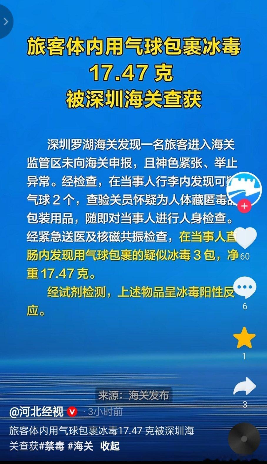 🔻旅客体内用气球包裹冰毒17.47克,被深圳海关查获。热点现场