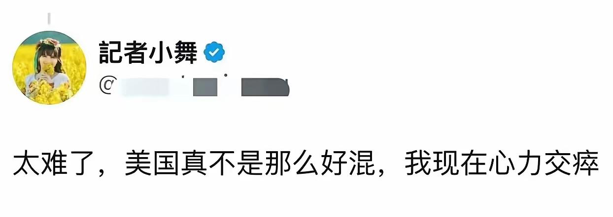 把紫叶狼尾草当狗尾巴的有名小侄人——记者小舞,继外卖账号被封后,X平台也被封了! 原本在国内,他还是一名知名记者,为了心爱的美国梦,为了心目中的灯塔,他毅然决然地去美国了,他深爱美国,以为到了美国,一切都会美好起来。可谁曾想,账号一个个被封了,连送外卖,赚点流量钱都不可能了。他深爱美国,可美国却不爱他!他只能感慨道:“太难了,美国真不是那么好混,我现在心力交瘁。” 大家说说按照斩杀线理论,他还能撑多久呢?