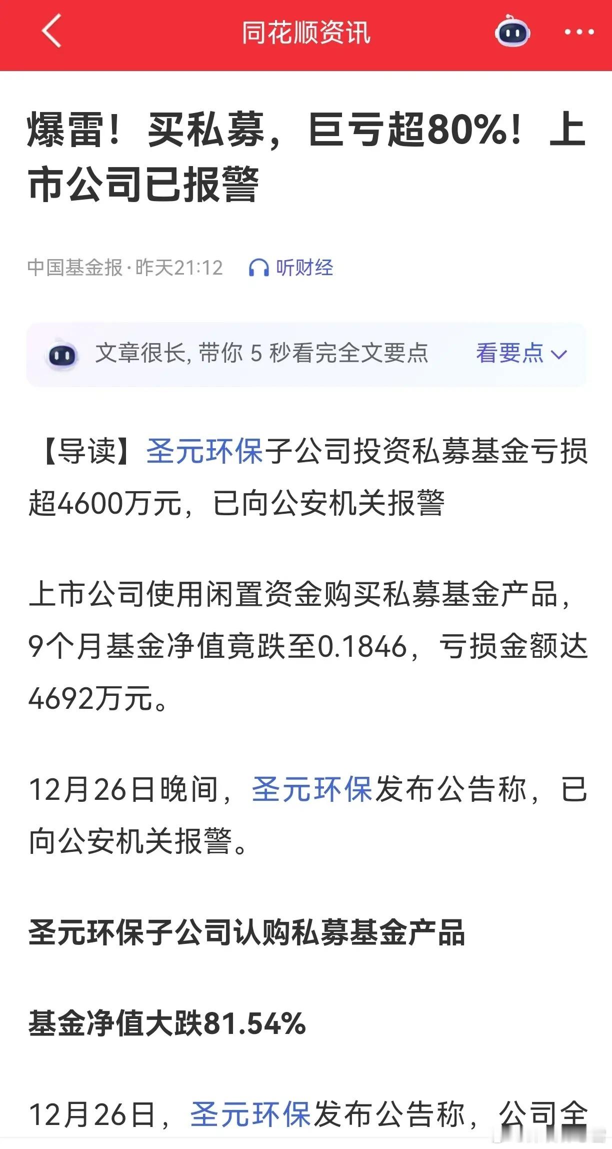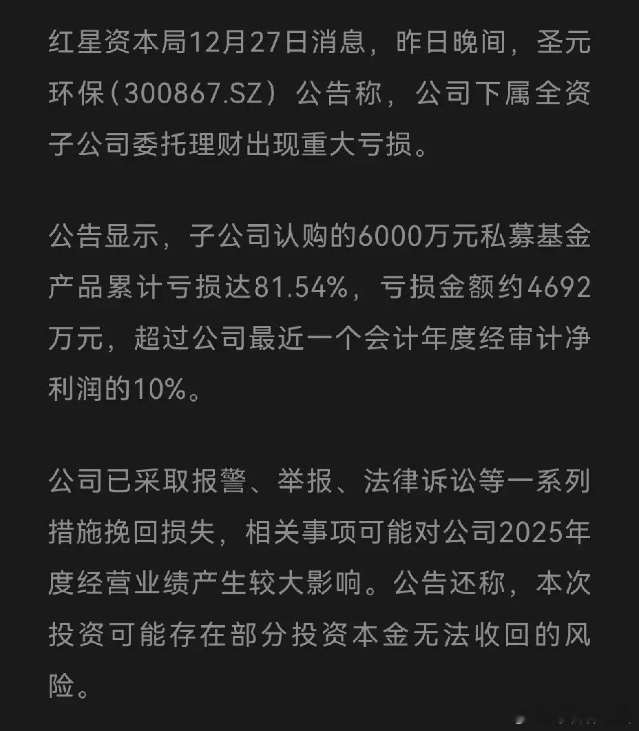 上市公司炒股巨亏80%+ 报警维权引热议圣元环保6000万认购私募基金,最终亏掉4692万元,不“愿赌服输”反而选择报警、诉讼维权,这波操作属实让散户看愣了。散户炒股赔钱大多自认倒霉,一句“愿赌服输”咽下心酸,可上市公司亏了钱,却能拿起法律武器讨说法。说到底,不管是买股票还是买基金,本质都是投资,亏了钱维护自身权益本就无可厚非。反观不少上市公司,拿着自有资金扎堆理财,既不分红还惦记着圈钱,这般操作,真该好好学学圣元环保的“维权意识”!