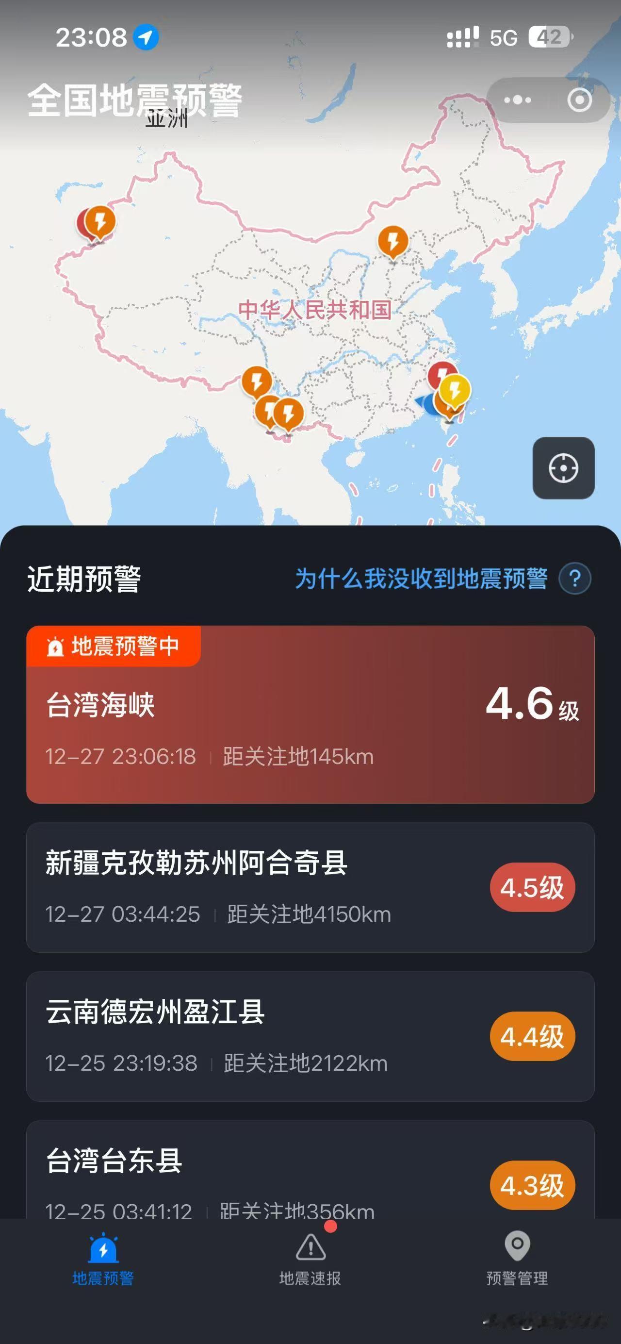 刚刚地震,你感觉到了吗? 晚上11点7分,被家人叫醒,说是地震了。醒时还在震 有点强烈。家人问跑不跑,我也不知道要不要跑,反正外面都很正常,没人喊“地震了,赶快跑”。 过了一小会,不摇了,也暂时睡不着了,发现才晚上11:07。打开手机,微信群里正说着地震呢! 一个说:“地震!” 又一个说:“摇得很厉害!” 一个又说:“摇晃很厉害。” 再一个说:“刺激,第一次在一楼都这么明显。” 又一个说:“我坐在摊位上看车一直摇。” 一个又说:“刚才站着接水,感觉站不住,是地震,看衣服都要晃。” 一个说:“震好厉害!” …… 这谈论地震,没玩没了了。 也不知道今年怎么这么多地震。1月21日地震,4月9日地震,7月23日地震,12月24日地震,再加上今天地震,大概有五次地震了。 网上搜一下,据中国地震台网自动测定:2025年12月27日23时5分在中国台湾地区(北纬24.66度,东经122.35度)发生6.5级左右地震。 台湾地震,没我们福建什么事,早点睡吧!地震来了不慌张