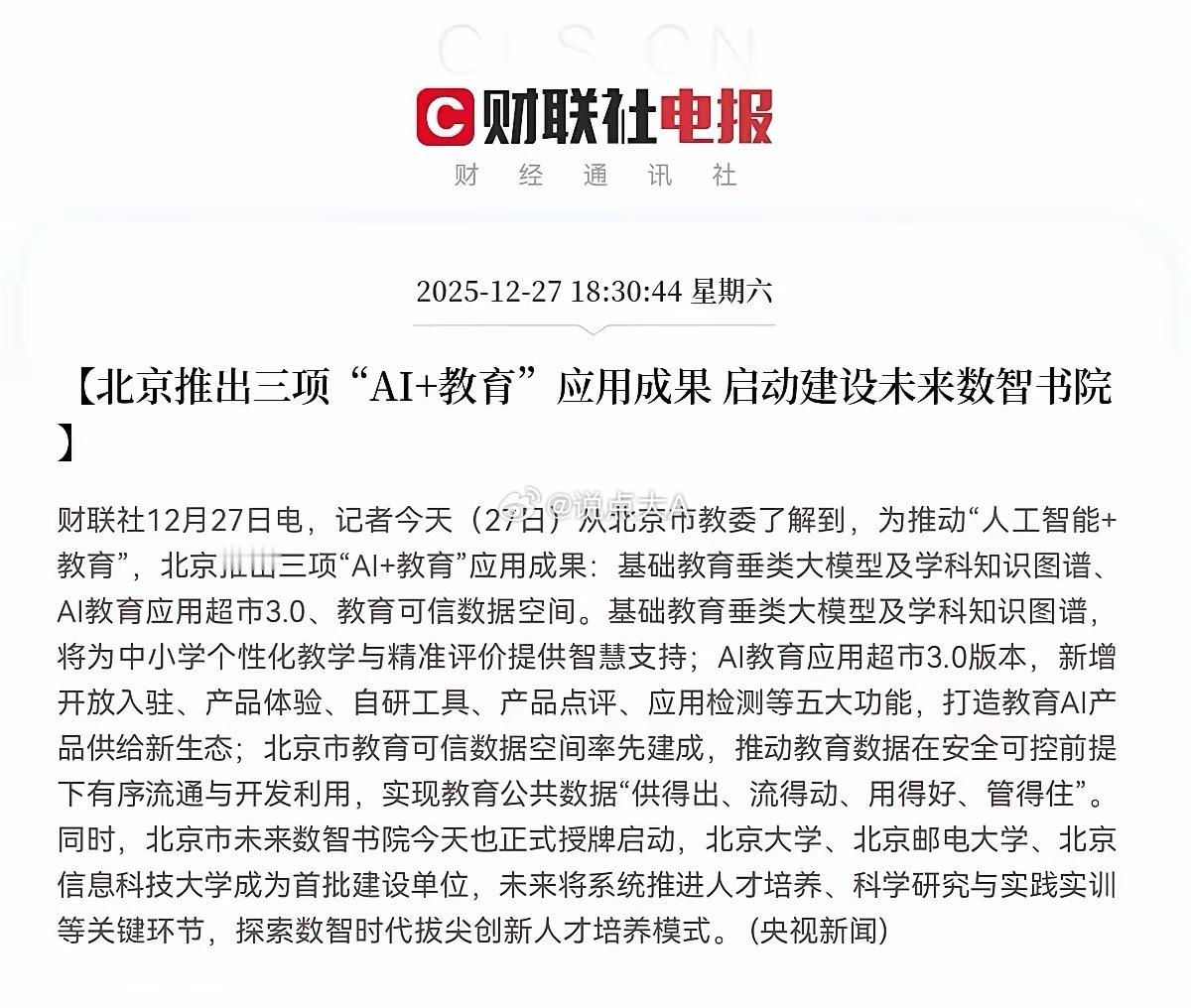 大利好!大利好来袭!“AI+教育”迎来重大利好…不出意外的话,AI+教育概念要起飞了,核心AI教育公司有望受益了晚间10点10分,又看到财联社上的一条利好消息,赶紧分享一下,以防有人错过了这条利好消息,今日为推动“人工智能+教育”,北京重磅推出了三项“AI+教育”应用成果,启动建设未来数智书院,这个消息出来后,股民们的热情又被点燃了,一致认为这对于教育产业是大利好,北京今日集中发布三项“AI+教育”核心成果,标志着该领域从概念试点迈入规模化、生态化建设的新阶段,这为资本市场指明了清晰的投资主线,AI教育产业前景广阔,它正站在政策支持、技术突破和生态成型的大风口上,“AI+教育”赛道迎来了确定性投资机遇,值得重视!股民们!坐稳扶好!受利好消息影响,AI应用又站上风口了,下周AI教育概念又要大爆发了!