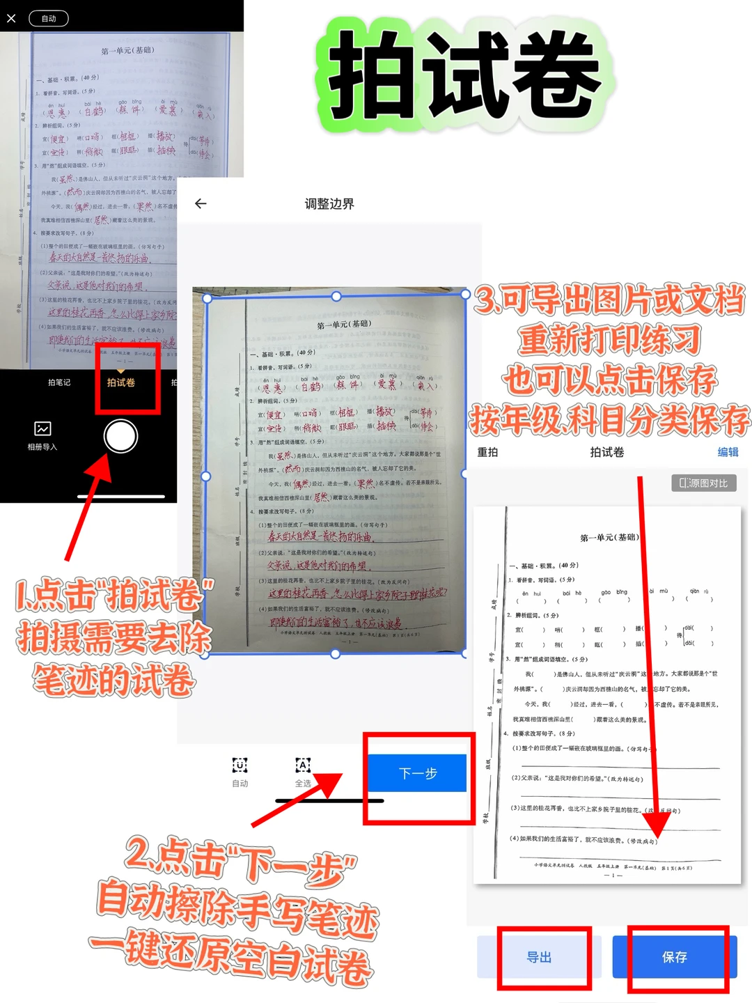 [一R]拍试卷✨:有时候孩子试卷写得不理想,想再重新做一次,就可以通过拍照识别试卷,轻轻一扫,自动清除手写笔迹,还原出干净的空白试卷,方便孩子进行重新练习或打印。