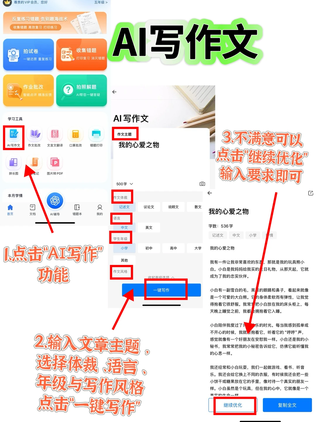 [三R]AI写作文✨:作文是孩子学习的一大难题,写好一篇文章,对于语文考试来说是很重要的。平时写作没有头绪的话,我们可以试试这个功能“AI写作文”,输入文章主题, 选择体裁 、语言 、年级与写作 风格,一键生成文章,家长可以通过AI写作文指导孩子如何写出一篇好文章。
