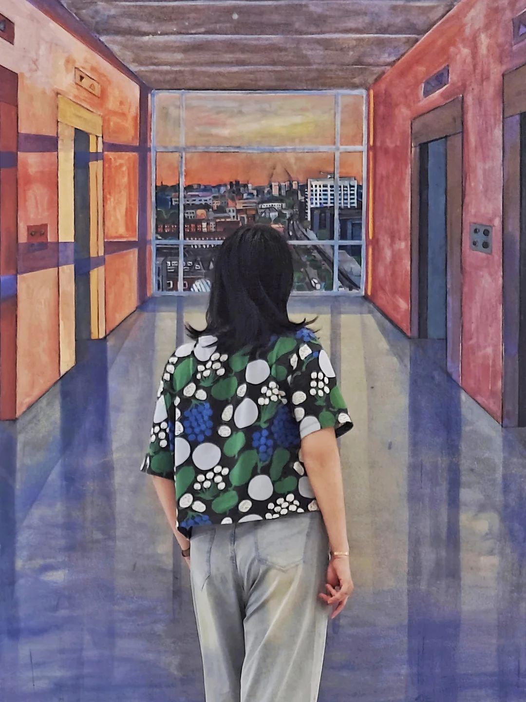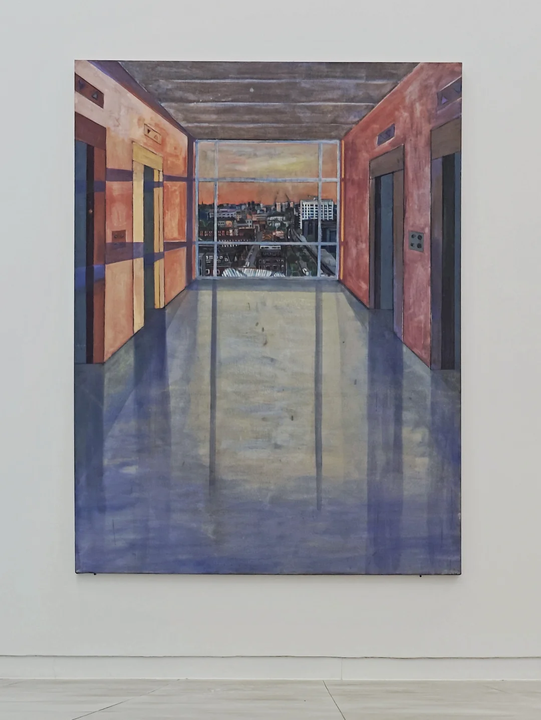 ??作品承载着与艺术家记忆相关的微小细节。《Floor 14(night)》与《Floor 14(sunset)》描绘医院电梯前的走廊,虽无人物,却传递出建筑的静谧、城市的存在感及她独自探病的孤独情绪;《UCLH》中伦敦BT电视塔从普通地标变为哀伤、记忆与眷恋的见证者,与她的经历紧密相连。