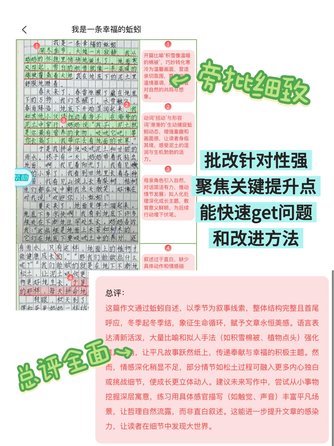 🌈反馈可落地:不只指出问题,还会给具体修改方向(如把“我很开心”改成“攥着奖状的手冒了汗,嘴角压不住地往上翘”),学生能直接照着调整,避免知道要改但不会改的困境。