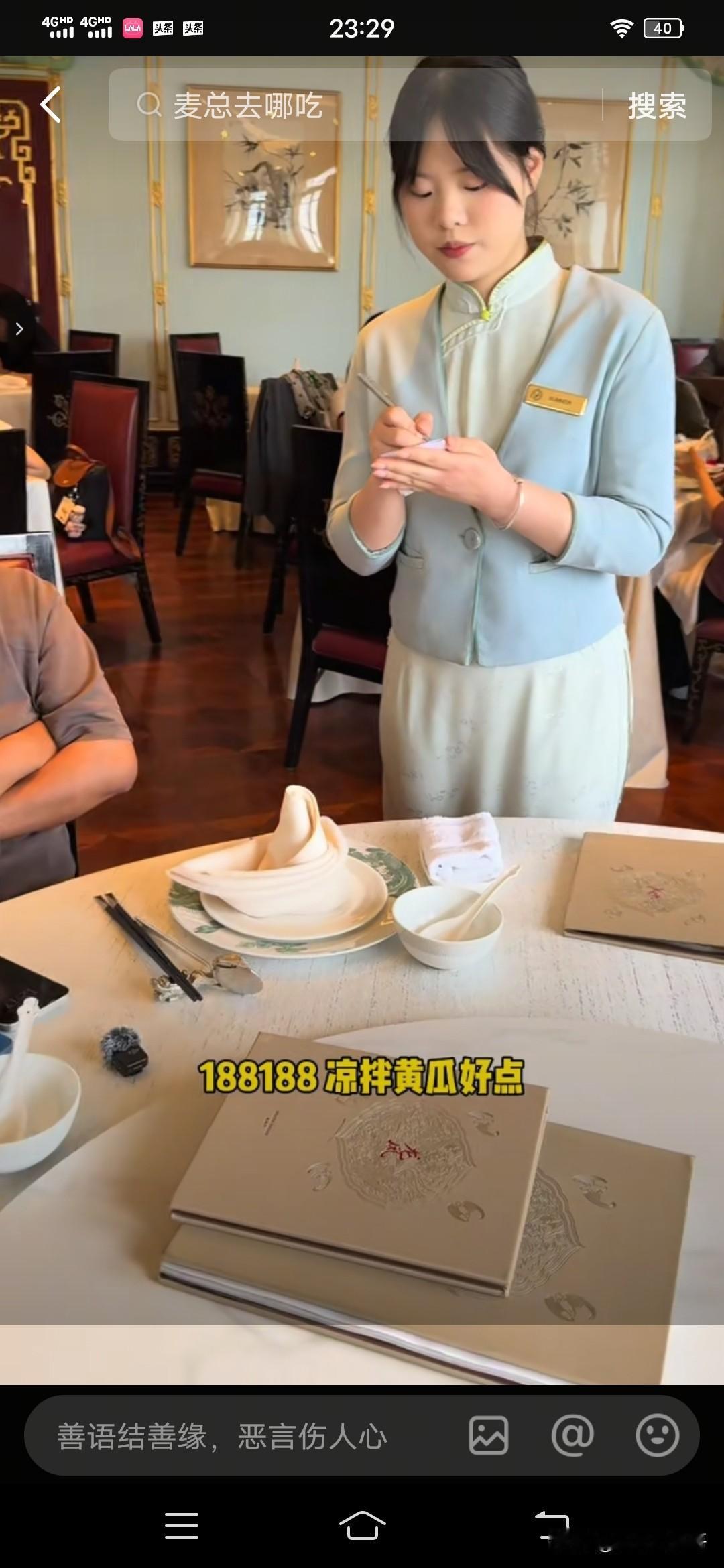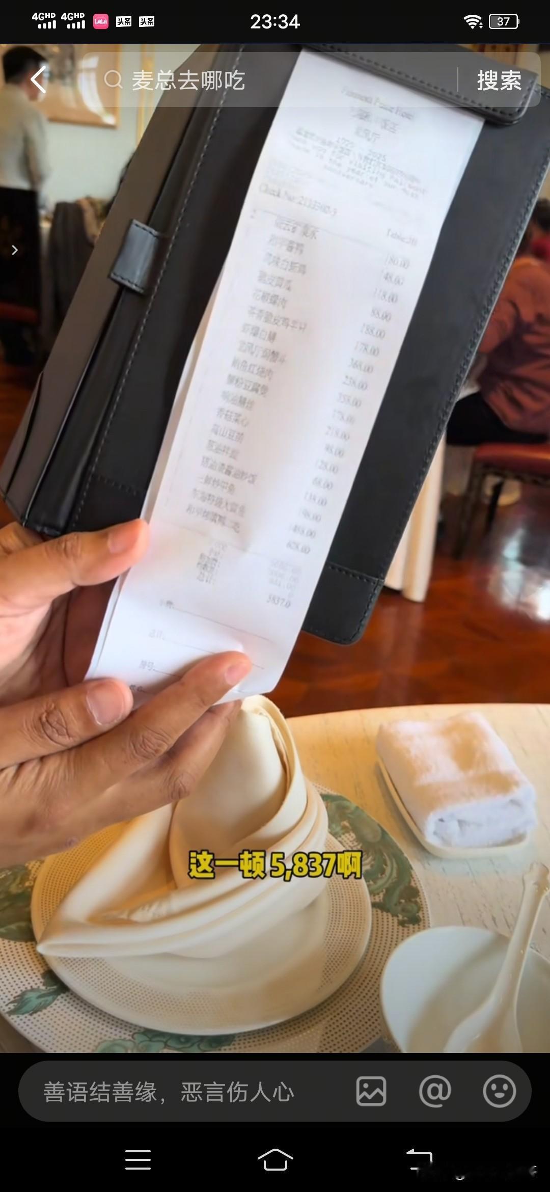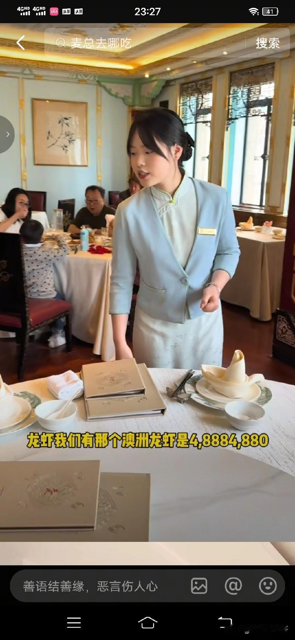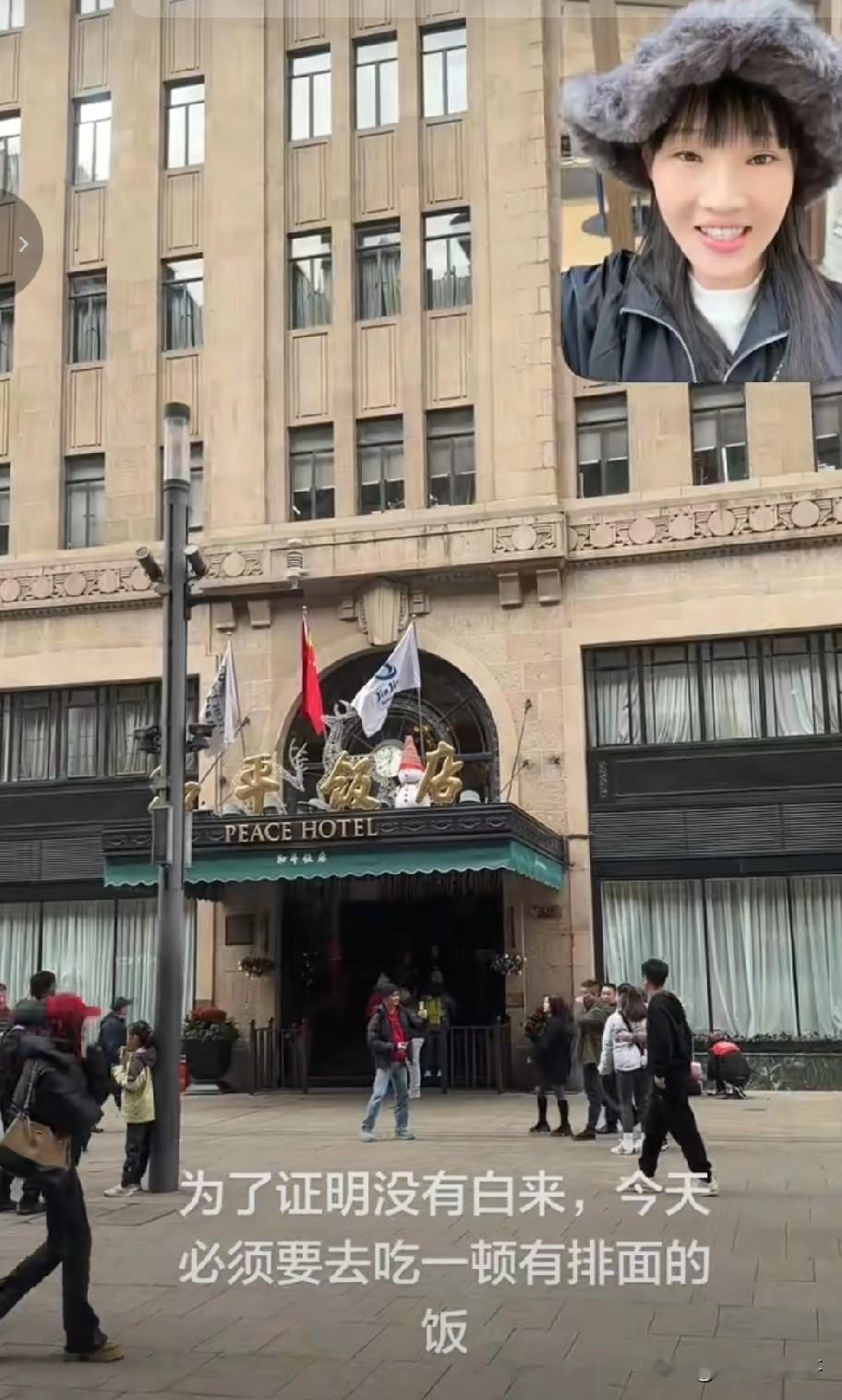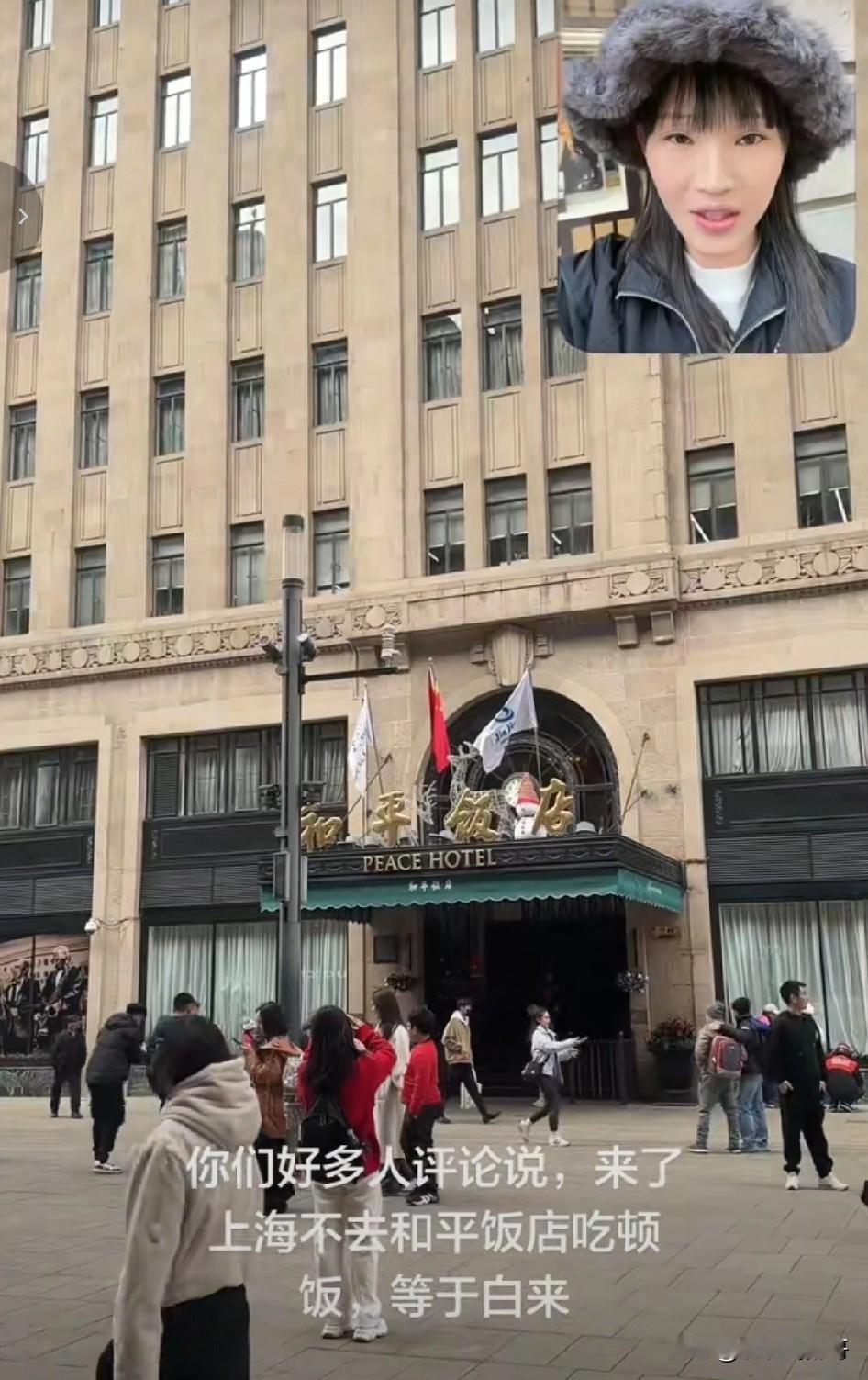 有一位女博主到上海和平饭店前拍了一张照片, 有朋友留言说到了上海不去和平饭店吃顿饭等于白来 。 于是这个女博主就去和平饭店吃了一顿饭,没想到一顿饭吃下来, 她火了,因为她可能创造了和平饭店的历史 ! 进了饭店 , 女博主才知道,要想在和平饭店吃饭,还得提前预约;靠窗的位置, 必须最低消费700一位 ;普通位置没有最低消费 。 饭店不提供免费的水果,榨菜之类的小吃 。 女博主看了菜单,问服务员可以先来一碗米饭吗?服务员点头说可以 。 于是让服务员先给她点一份米饭 ;接着服务员问她需不需要酒水 , 女博主问最便宜的水是什么水, 服务员翻着菜单说:柠檬水最便宜,一杯10块 。 女博主说那来一杯柠檬水吧 。 不久女博主点的米饭和柠檬水服务员送了过来 。 于是女博主开始用餐 。 这碗米饭15块,女博主吃的很慢 , 一边吃一边观察着四周, 食客们交谈的交谈,吃饭的吃饭; 服务员们各自忙碌着,没人注意她。 女博主边吃边说:和平饭店的饭就是香 ,随后喝了一口柠檬水, 忍不住说:很多人说和平饭店吃饭很贵,不敢进来 ,你看我还不是进来吃饭了。 不过很快女博主就笑了 ,自语说:好尴尬,整个饭店就我一个人没有菜, 只有一碗饭和一杯柠檬水。 吃了几口饭,女博主感觉饭太干,于是将柠檬水倒进饭里泡饭吃 。 柠檬水泡饭, 在和平饭店 ,女博主可能是第一人 。 一碗白米饭,女博主吃的干干净净。 饭吃完,女博主就叫服务员结账 。 服务员递给女博主账单,女博主一看此次消费共计29元 。 女博主接下来的一番话令我没有想到,她对服务员说:美女,你好, 我是我们村 第一个到上海和平饭店吃饭的人,你可以叫我一声周总吗?这样显得我很有面子 。 服务员听了很温和的笑着说: 可以,周总,你好 。 女博主开心的笑了。 随后扫码付费 。 服务员还问女博主需不需要发票,女博子说不需要。 随后服务员说,谢谢,祝你玩的开心 。 上海和平饭店体验用餐完美结束, 只花了29元 。 接着我又刷到一个视频,是三个男子到和平饭店吃饭, 是冲着和平饭店的名气去的。 他们听说和平饭店吃饭贵,于是来尝试一下,看看究竟有多贵。 服务员介绍店里面的酒水,大瓶矿泉水90块一瓶, 可乐轻装的一瓶50块, 澳洲龙虾4888 ,豆腐炖大肠260六一份 ,凉拌黄瓜188 , 最后三个人一这顿饭吃下来花费了5837元。 看来去有名气的饭店吃饭, 吃的不是饭 ,而是氛围 ,一份心情 ,跟消费多少无关 !