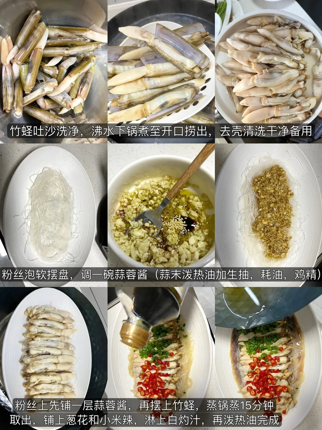 🍀蒜蓉竹蛏:现在是吃竹节蛏的最好季节,又肥又美味简直鲜掉眉毛,话说我也是头一次买到这么肉大的竹蛏子,30元买了两斤,推荐这个蒜蓉粉丝的做法,一口下去真的好满足!