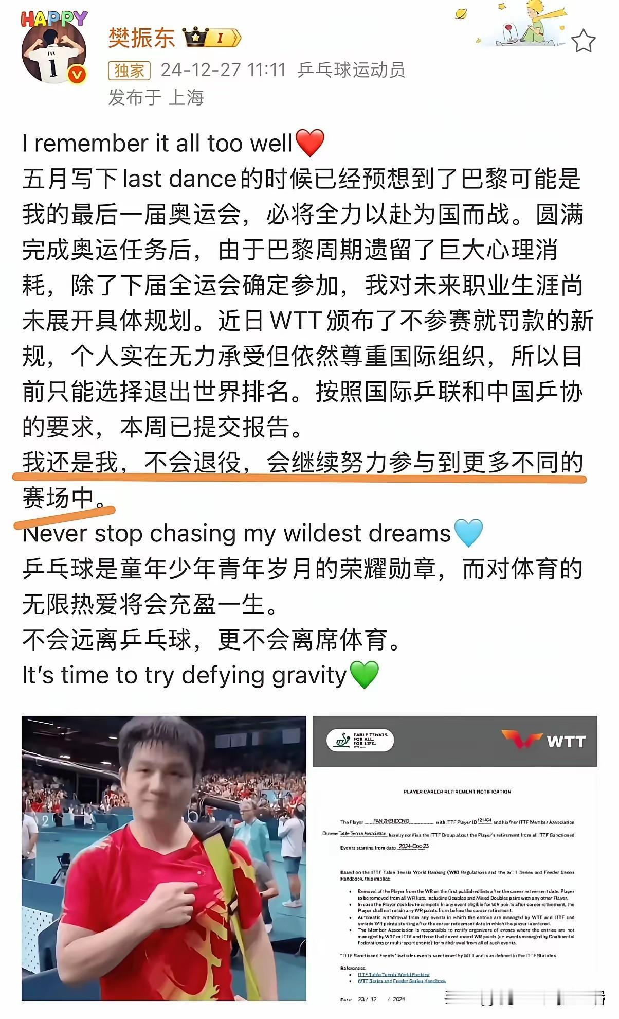 今天是樊振东离开国际赛事的一周年。再次重温樊振东2024年12月27日发的那篇微博。 五月份就预想到了巴黎是最后一届~~巴黎周期心里消耗巨大~~只确定全运会参加~~WTT颁布不参赛罚款~~不退役,会参与到更多不同赛场。 他其实很早就开始规划自己的人生了,WTT的罚款规则只是一个契机。12月27日就已经筹划不同赛场。所以,去德甲只是在25年6月1日才万事俱备。 能参加2025年乒超联赛的前两个阶段的赛事已经是他额外的恩典了。如今不回来参加总决赛是早就定好了的。至于26年的亚洲杯,无论索林喊不喊话,再回顾他微博的蛛丝马迹,看来都不可能参加。而且今天的半决赛直播间是真的乌烟瘴气,王楚钦被骂,他也跟着受牵连。还是祝福他在德甲的乒乓赛道快乐吧