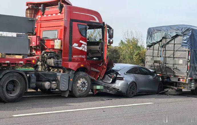 其实和智界S7(中间的车)扎实无关,智界S7的车主得要感谢后面大货车的不杀之恩。100吨的货车冲过来,除非2吨的乘用车是实心的铁块,啥材料都不顶用,车内空心的都会在巨大的冲击力下变成实心。