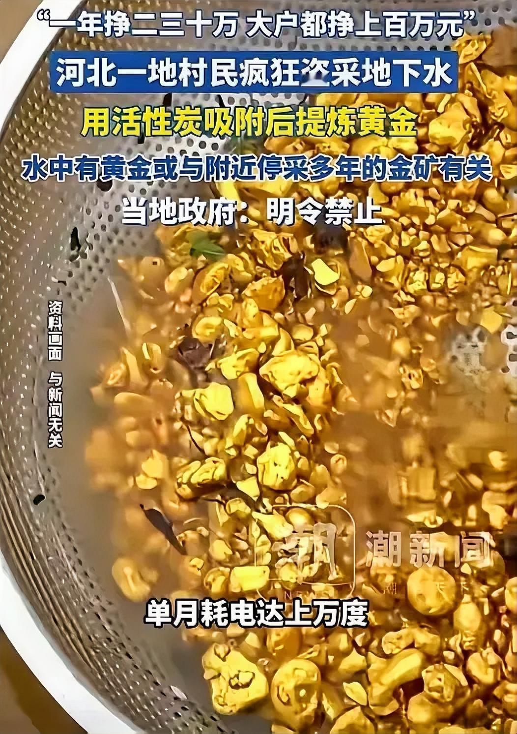 人心不足蛇吞象!河北有个村子里,有个村民抽地下水时意外发现了黄金,他没声张,悄悄搞起了炼金来赚钱,结果整个村子都跟着动了心。短短一个月,村里的用电量一下子就超过了1万度,甚至有人一年能挣到百万。不过好景不长,没过多久,地下水位就一下子下降了6米,50多户人家的水井都干了,地里还裂开了不少缝子。 这事儿还得从2020年夏天说起。村民小郑在浇地时,突然发现灌溉的水里有细碎的金光在晃,赶紧找专业机构一测,才知道水里竟然真的含有黄金成分。他没想着上报给相关部门,反而偷偷在自家院子里打了口80米深的井,24小时不停地抽水来炼金。就这么干了三个月,小郑手里就进账了十几万。这消息一传开,全村人都放下锄头跟着去炼金,不少人把电动车换成了越野车,家里的电表也转得飞快。 但这疯狂的背后,藏着的是让人害怕的代价。炼金用的化学试剂偷偷排进了河里,把河水都污染了;地里的庄稼也跟着枯黄,收成都没了;村里的邻居们还为了抢井位,吵得面红耳赤,甚至还动起了手。最后还是有人忍不住打了举报电话,执法部门很快就来查封了那些炼金设备,村民们这才明白过来:地下的矿产都属于国家,要是非法开采,最后肯定要为环境修复花大价钱,这代价可不小。 其实这样的事儿在甘肃、云南这些地方也不少见。靠这种掠夺式的方法换来的财富,最后根本抵不过土地的“反击”。等井水都干了,家园也变得破败不堪,到那时候,就算有再多的金子,也换不回以前的绿水青山了。您说,这到底是天上掉下来的馅饼,还是自己给自己挖的坑呢? 下井金矿 挖到黄金 金矿藏量