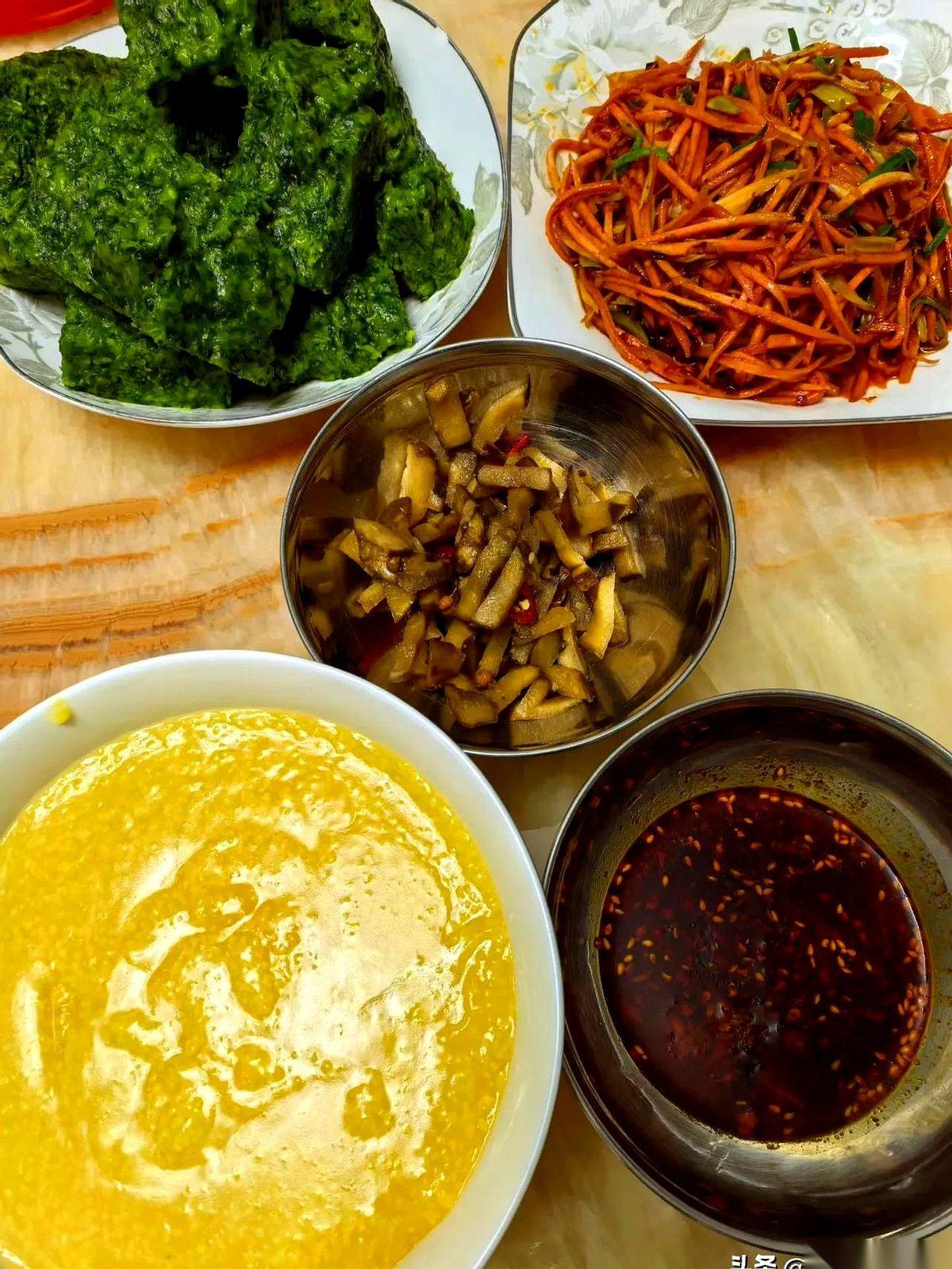 灵魂,就是那碗辣子水水。 别问我这是啥,这是刻在我们陕西人DNA里的早餐编码。 一碗热腾腾、金黄粘稠的苞谷珍下肚,整个人从里到外都熨帖了。 再撕一块绿油油的“菜biabia”——对,就叫这名儿,土得掉渣,但香得要命。 往那碗灵魂里头这么一蘸,吸满了汤汁……嚯! 辣子的香,菜的甜,还有一点点微酸,全在嘴里炸开。舒坦! 说真的,什么咖啡配牛角包,什么精致brunch,在它面前都得往后稍稍。 那不是一个级别的。 那些是吃给别人看的,我们这是吃给自己活的。 一顿饭,没一块肉,但那种从胃里升腾起来的踏实劲儿,比啥都顶。 它不光是一顿早饭。 它是一天奔波的底气,是回家才能吃到的那口念想。