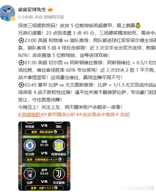皮皮公推三连爆收!比萨 vs 尤文稳如磐石💥今日公推三场全部拿下!高命中率靠的不是运气,是硬核数据拆解 + 赛前精准预判!最后一战锁定意甲 ——03:45 比萨 vs 尤文图斯,毫无压力!⚠️ 尤文双线作战拉满,主力体能见底,轮换已是板上钉钉📊 比萨主场保级战意拉满,近期主场不败率 70%,韧性十足📈 往绩参考:尤文近年客战保级队,从未净胜 2 球以上,受让格局优势明显!近 30 场公推命中率 75%!关注 + 评论 “皮皮稳了”,私发本场完整数据报告!置顶评论看今日三战命中截图→