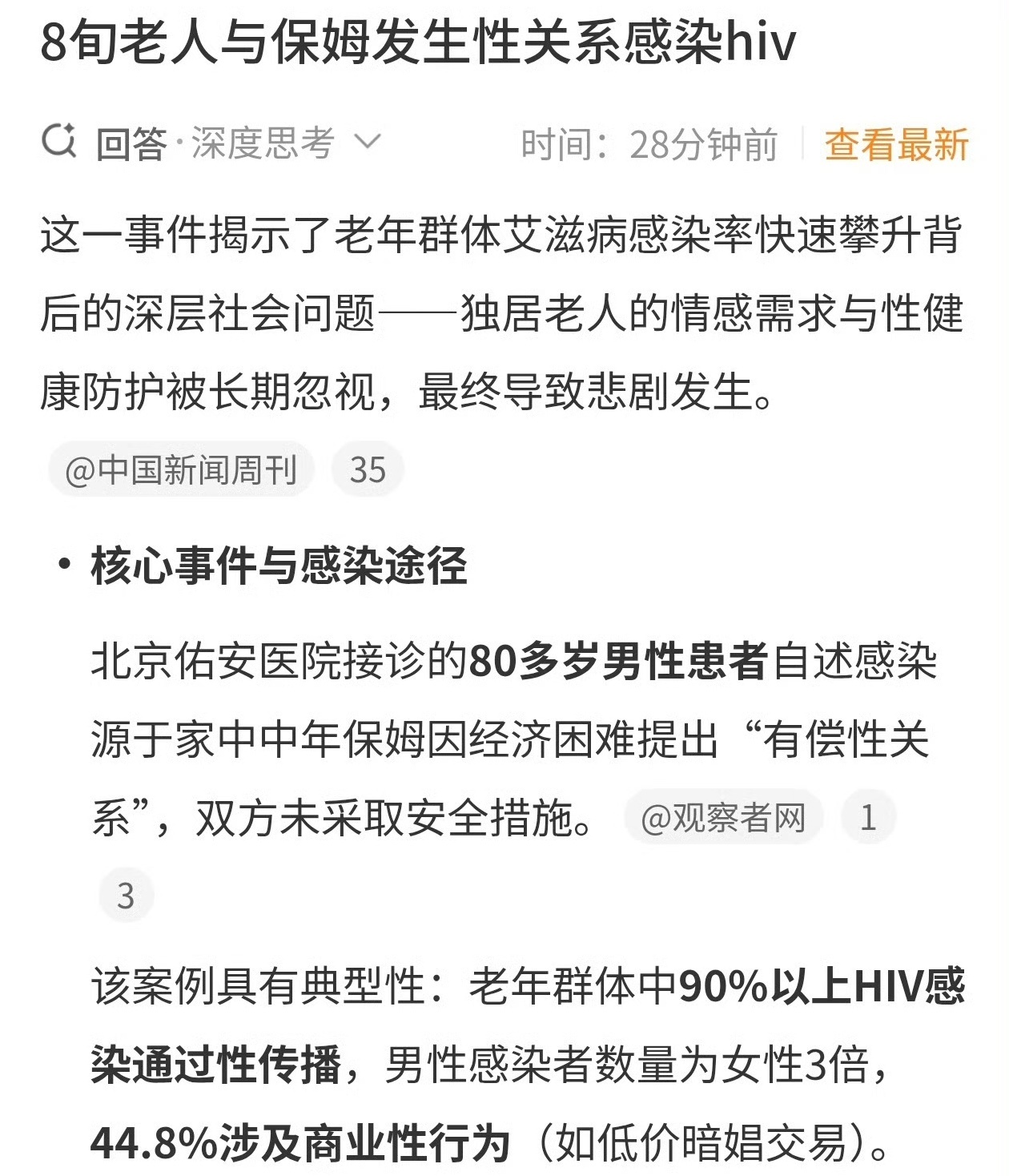 近日,有媒体报道“8旬老人与保姆发生性关系后感染艾滋病”,再次引发公众对老年HI